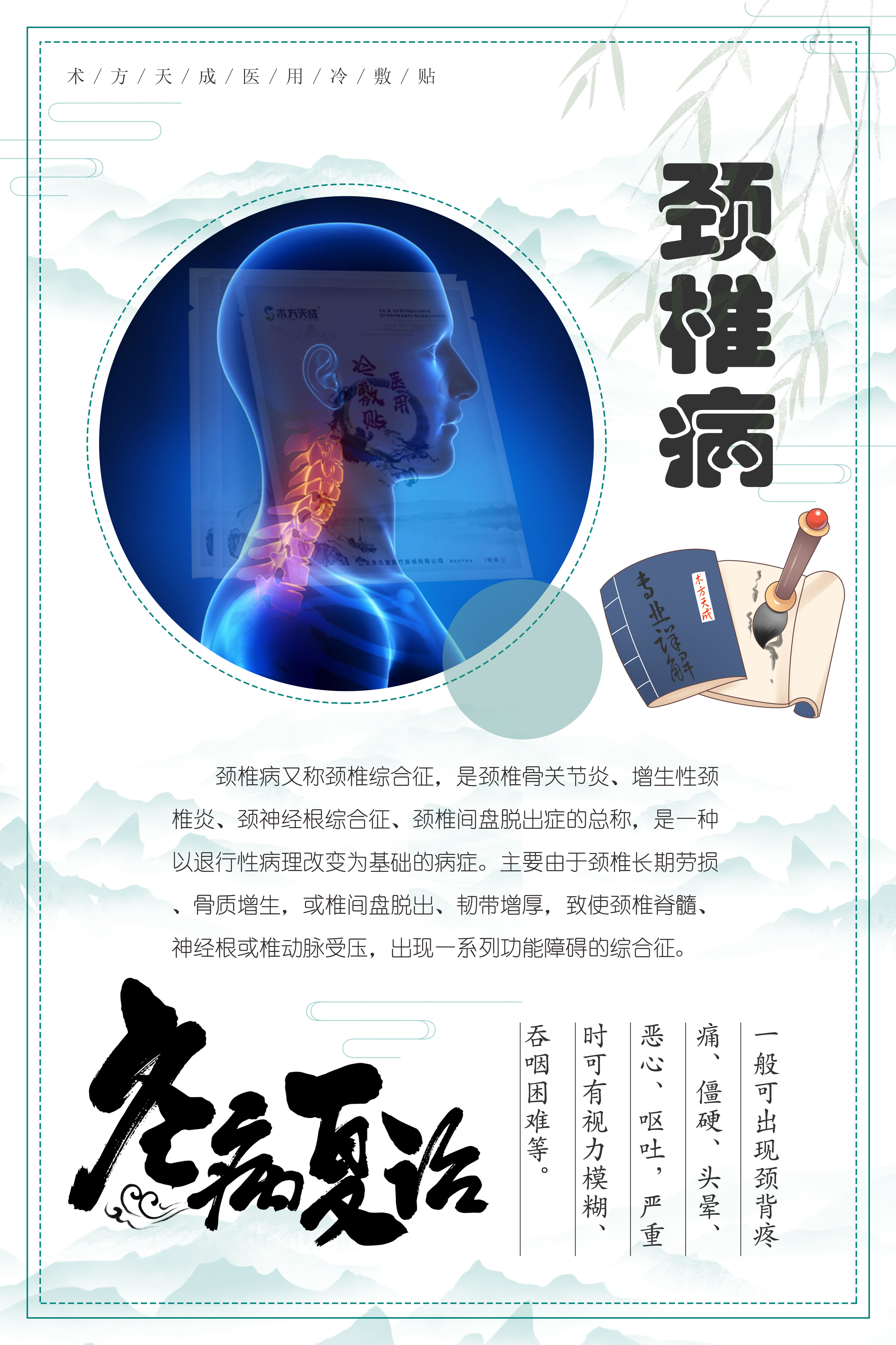 颈椎病又称颈椎综合征 疼痛头晕手麻常伴发生 主要由于颈椎长期劳损、骨质增生,或椎间盘脱出、韧带增厚,致使颈椎脊髓、神经根或椎动脉受压,出现一系列功能障碍。