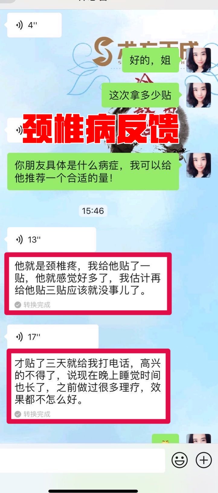 颈椎病反馈 这位顾客的朋友严重的颈椎病,贴术方天成三天就感觉好多了