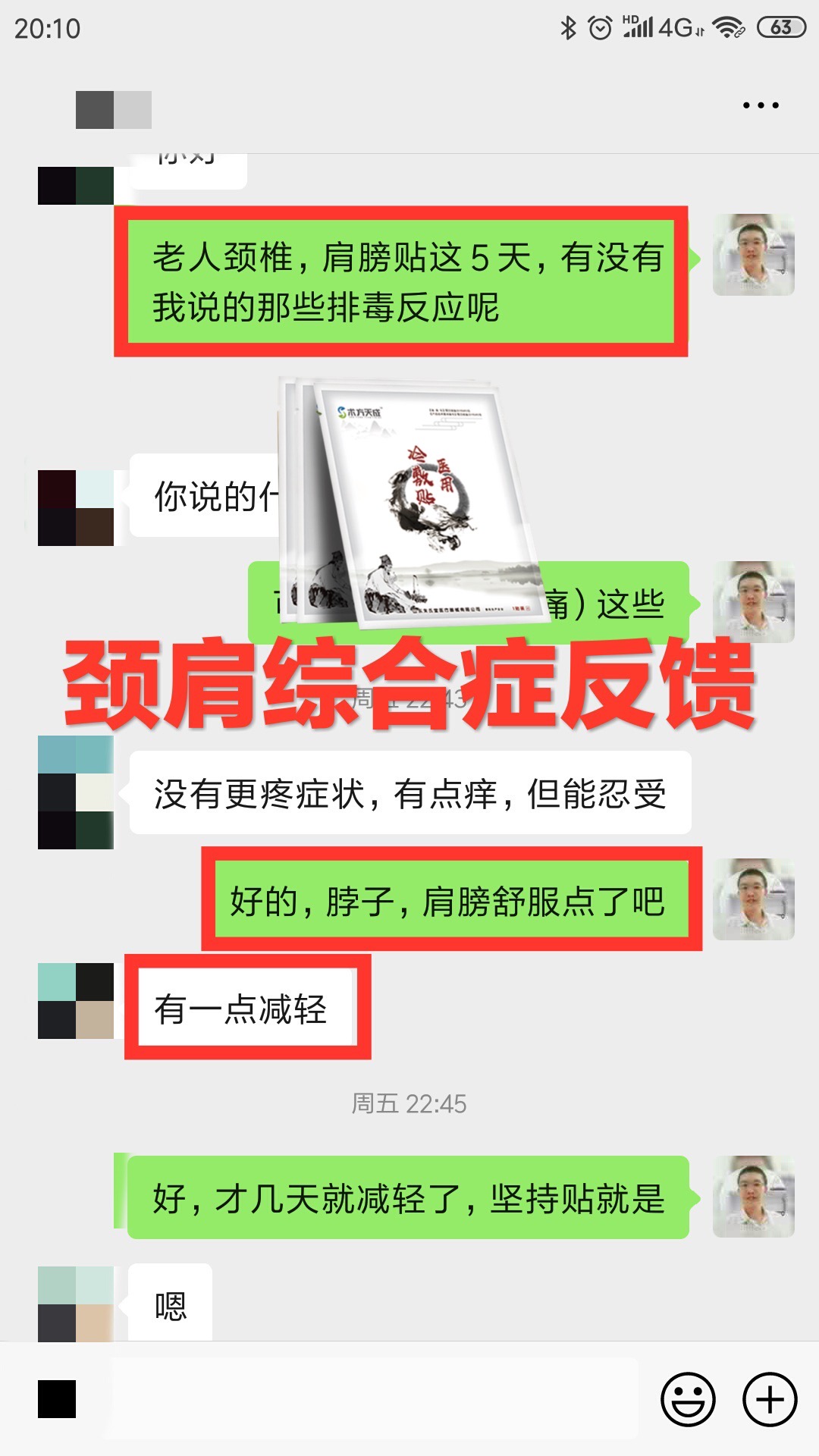 颈肩综合症反馈 大姐颈肩痛敷贴术方天成一个月,左边肩膀疼痛减轻,脖子僵硬的情况也改善了