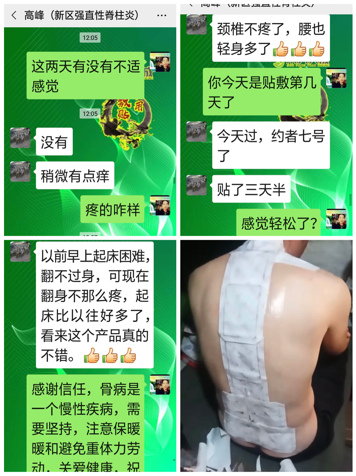 强直性脊柱炎反馈 顾客强直性脊柱炎贴敷术方天成4天,回访时说:颈椎不疼了,腰也轻松多了太给力了