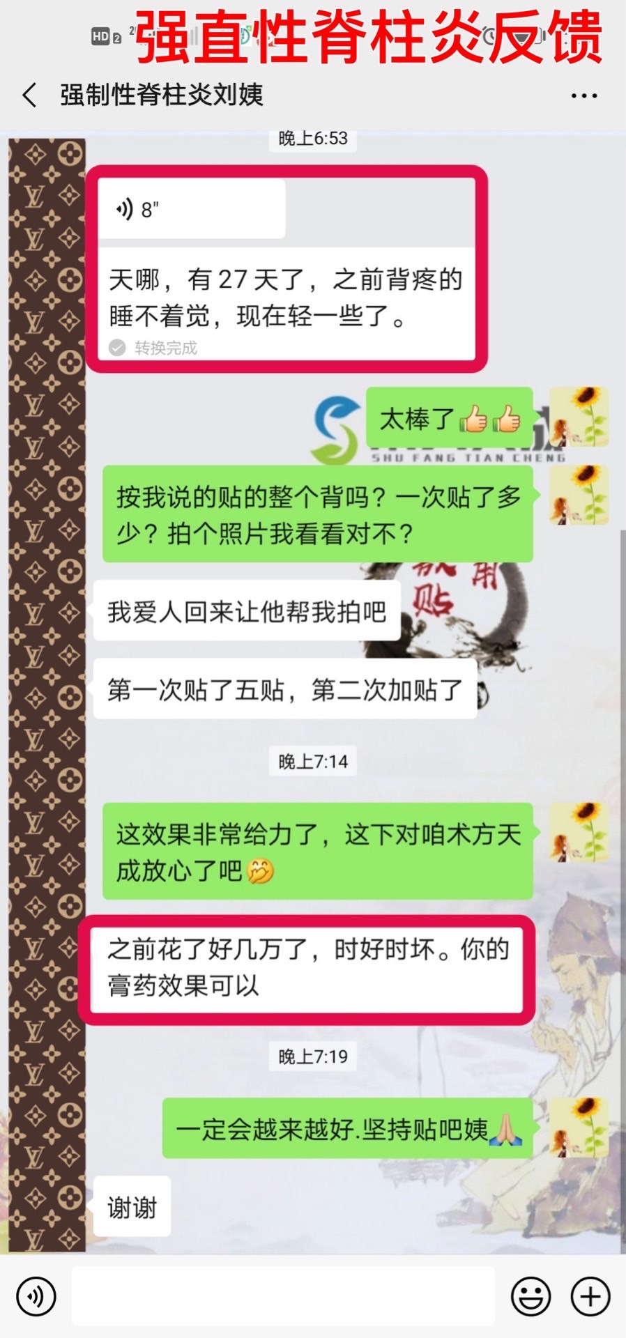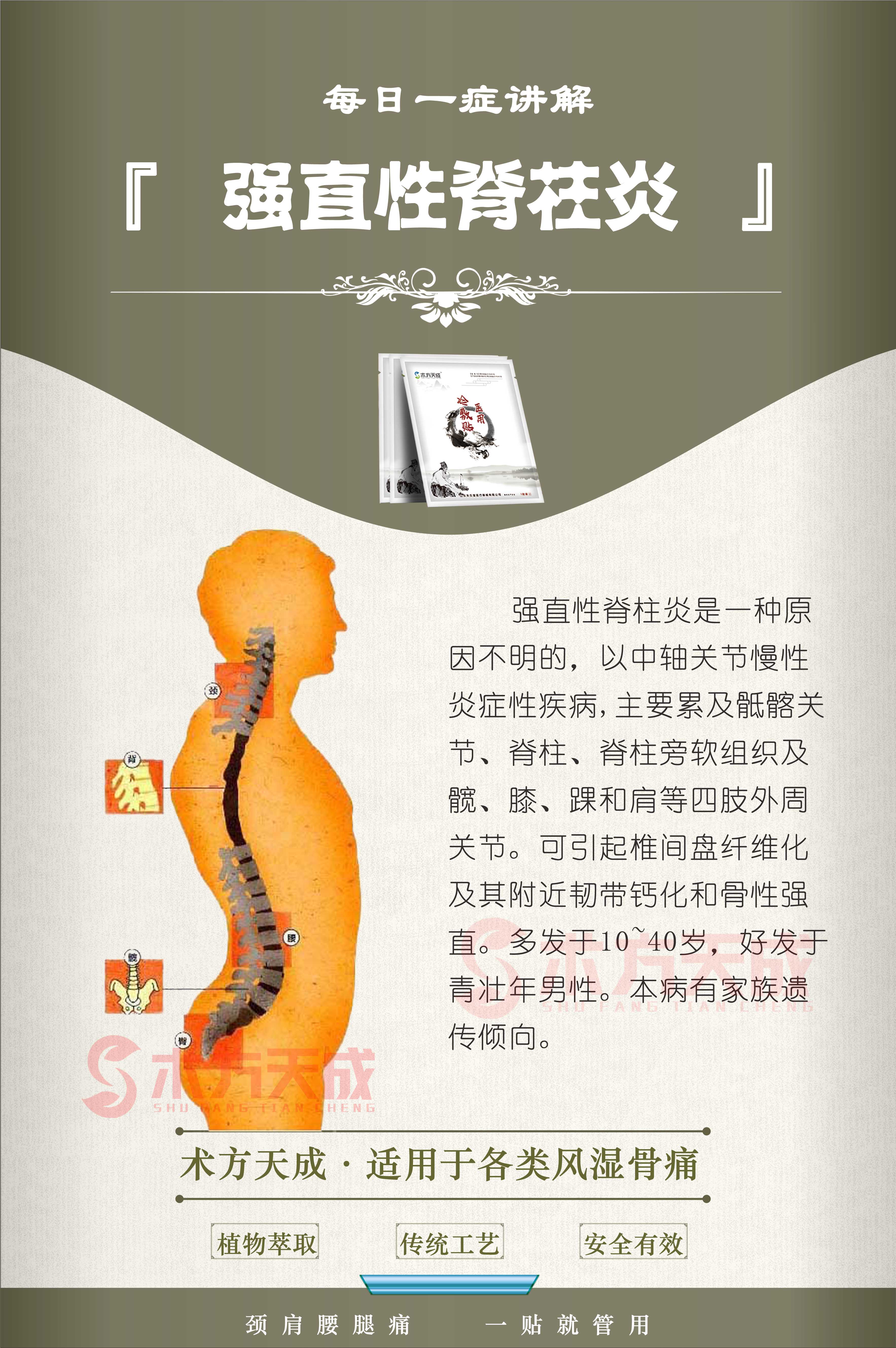 强直性脊柱炎反馈 贴敷术方天成一个月,顾客说好多了,还排出好多毒素。给术方天成一份信任,还您一身轻松