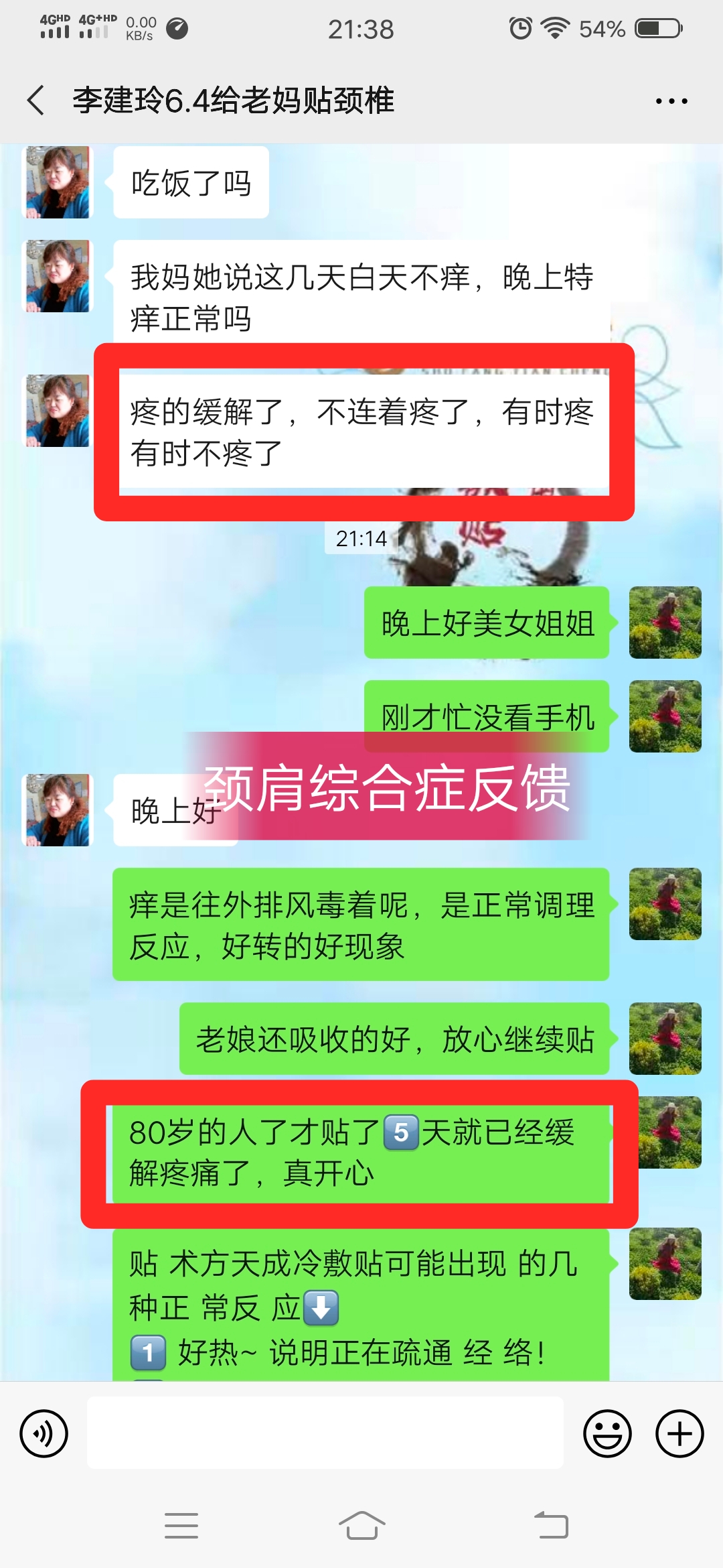 颈肩综合症反馈 大姐颈肩痛,敷贴术方天成一个周期好多了