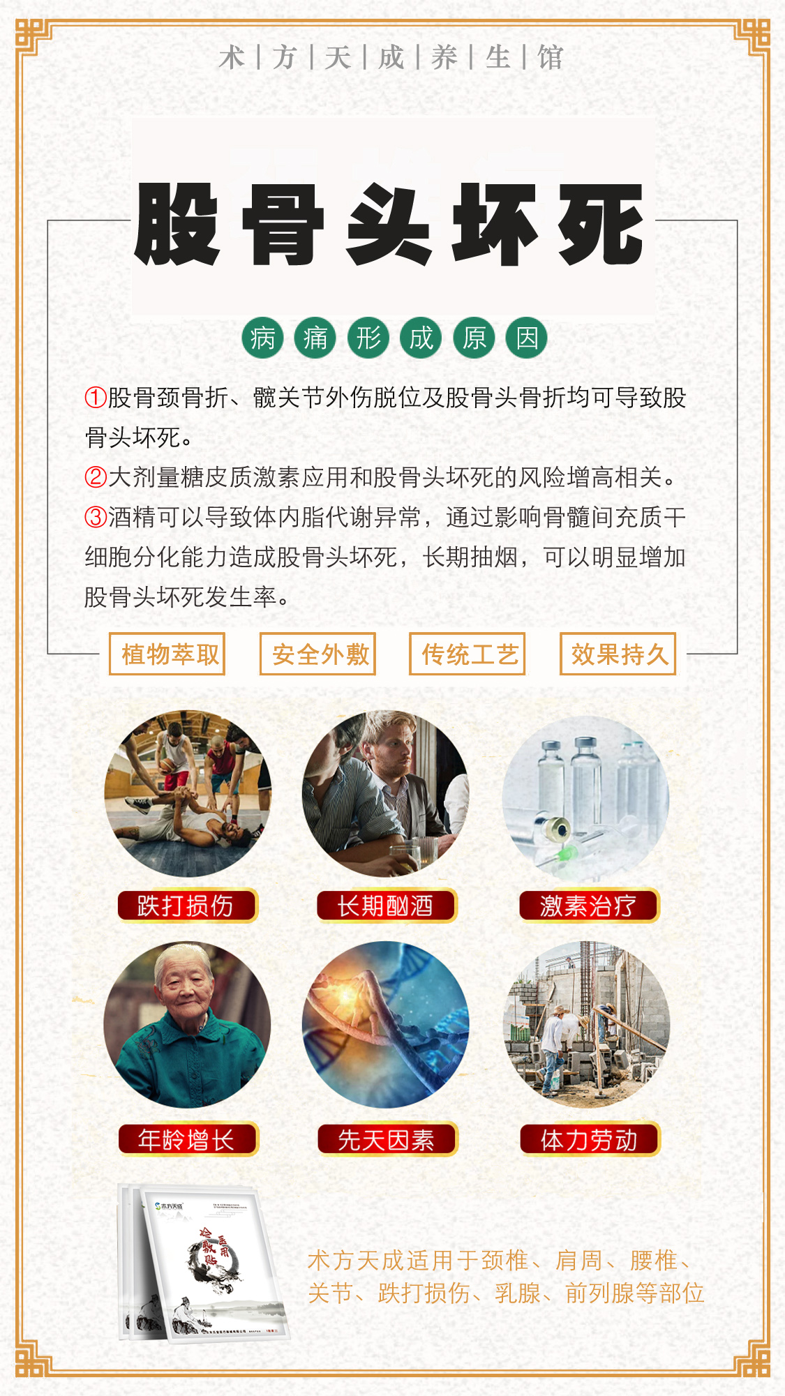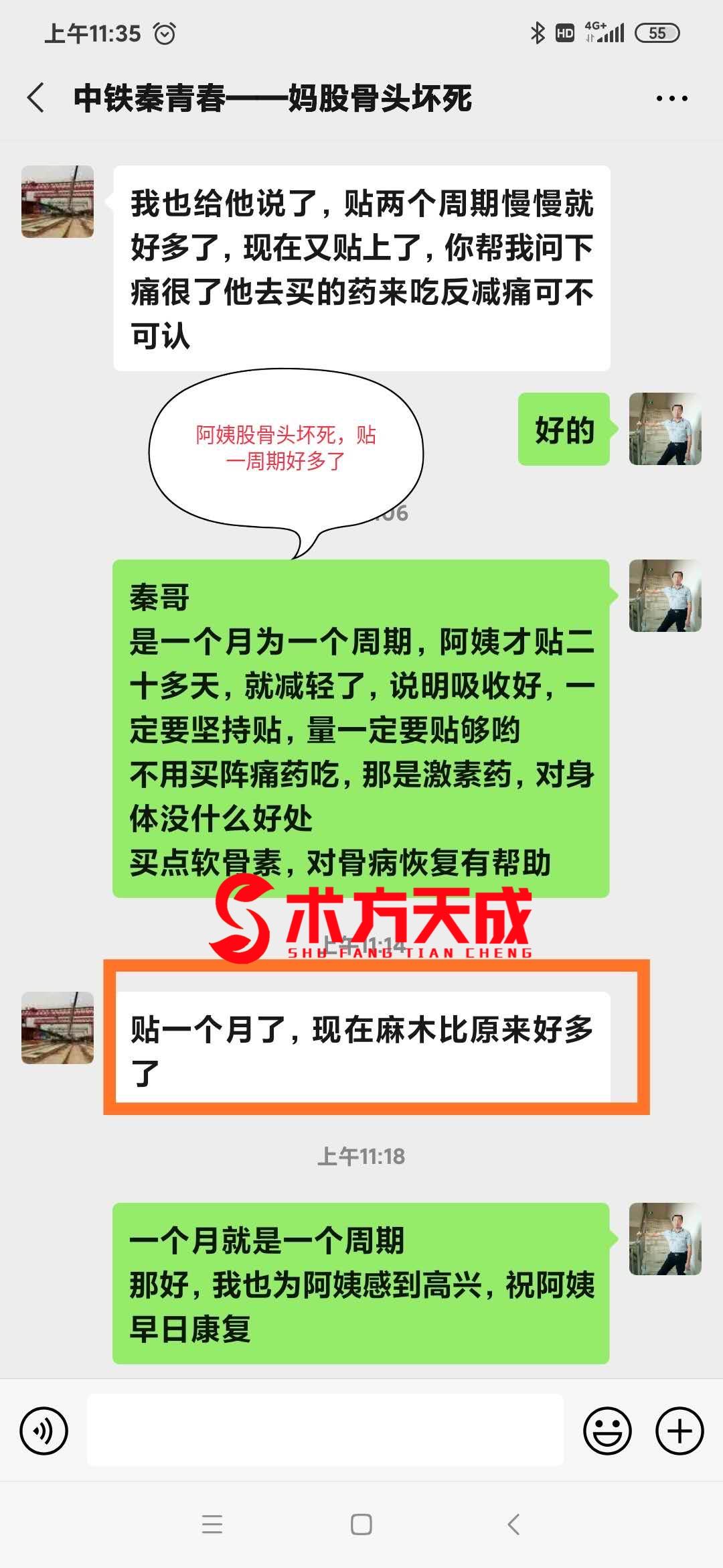 股骨头坏死反馈 八十岁的阿姨股骨头坏死,贴术方天成一个周期,回访说:好多了