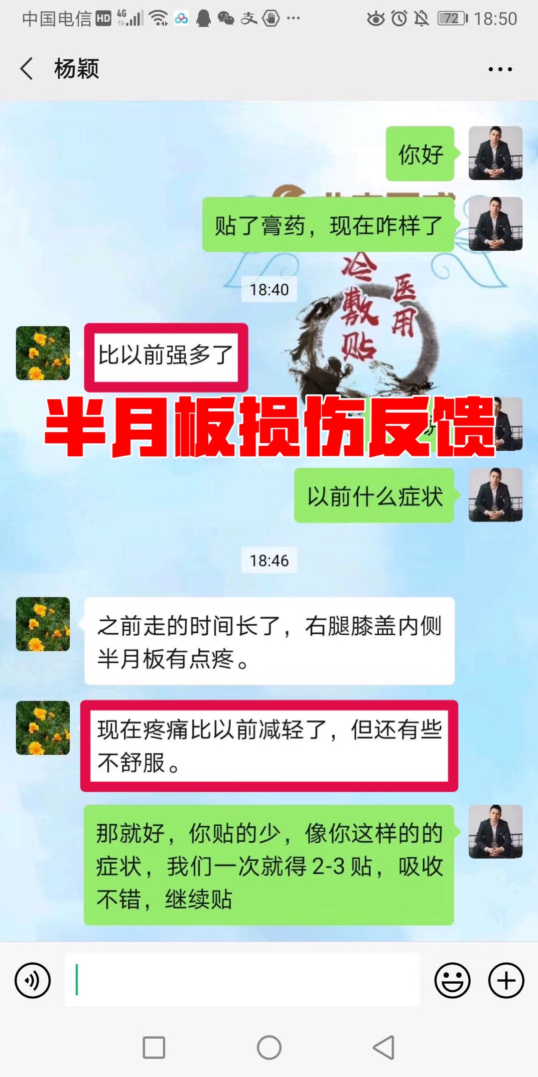 半月板损伤反馈 顾客贴敷术方天成前走路腿拉着不能打弯,贴敷10天后可以打弯了,真心为顾客开心