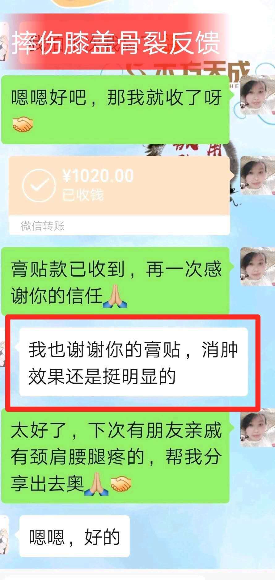 膝盖骨裂反馈 顾客膝盖摔伤导致骨裂,没贴术方天成时肿痛,用了一周期后消肿效果很明显
