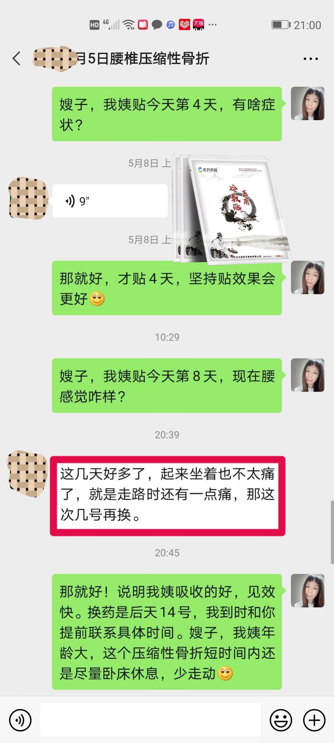 腰椎骨折反馈 顾客腰椎轻微骨折未手术选择保守恢复,贴敷术方天成三个周期,现在可以翻身活动了