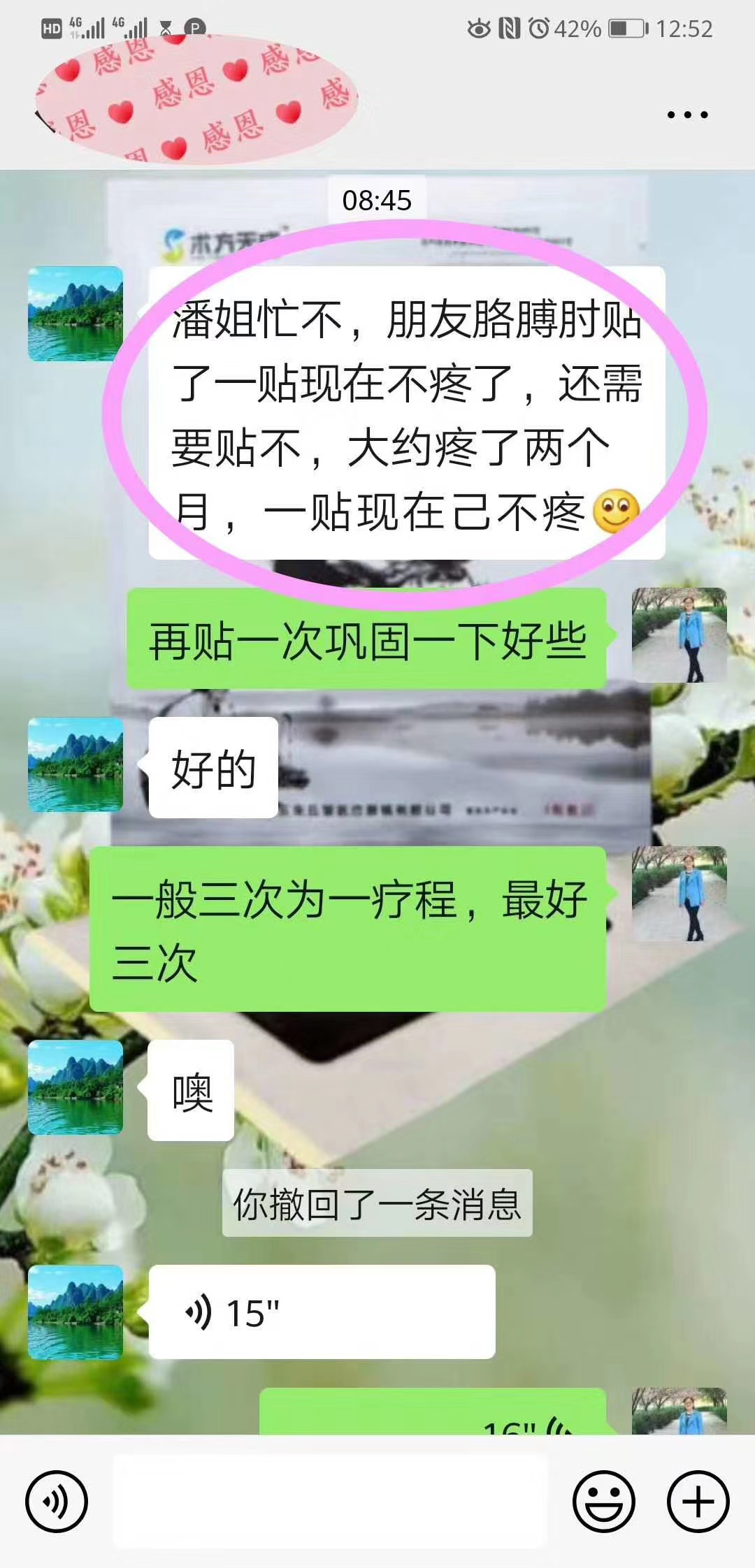 网球肘反馈 顾客胳膊肘疼痛两个多月,只用了一贴术方天成医用冷敷贴就说:不疼了冬病夏治事半功倍