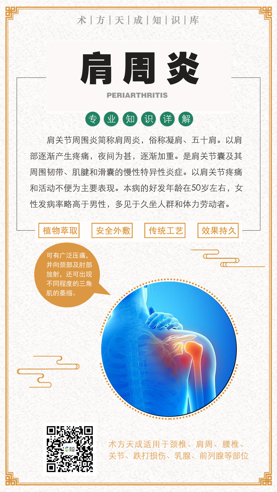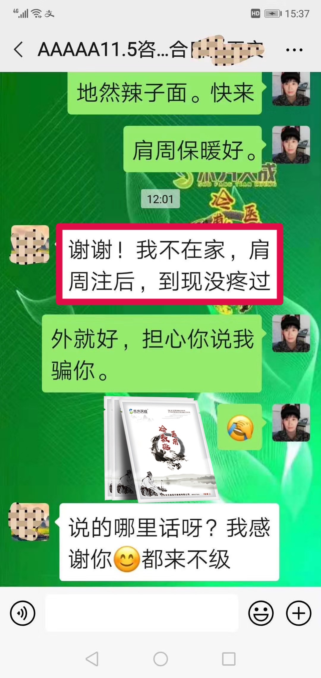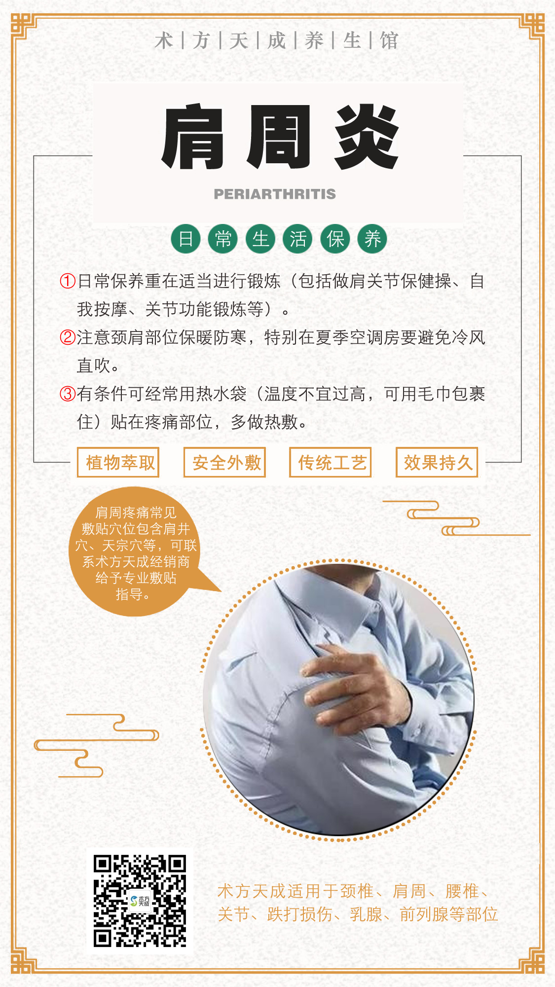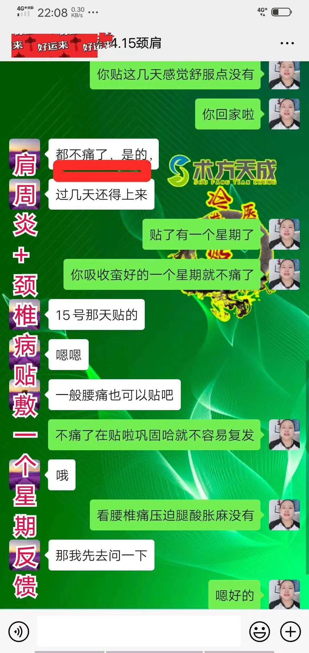 肩周炎反馈 去年用咱术方天成贴好的肩周炎,代理现在回访顾客说:没有再疼过术方天成,贴好不易复发的好膏贴