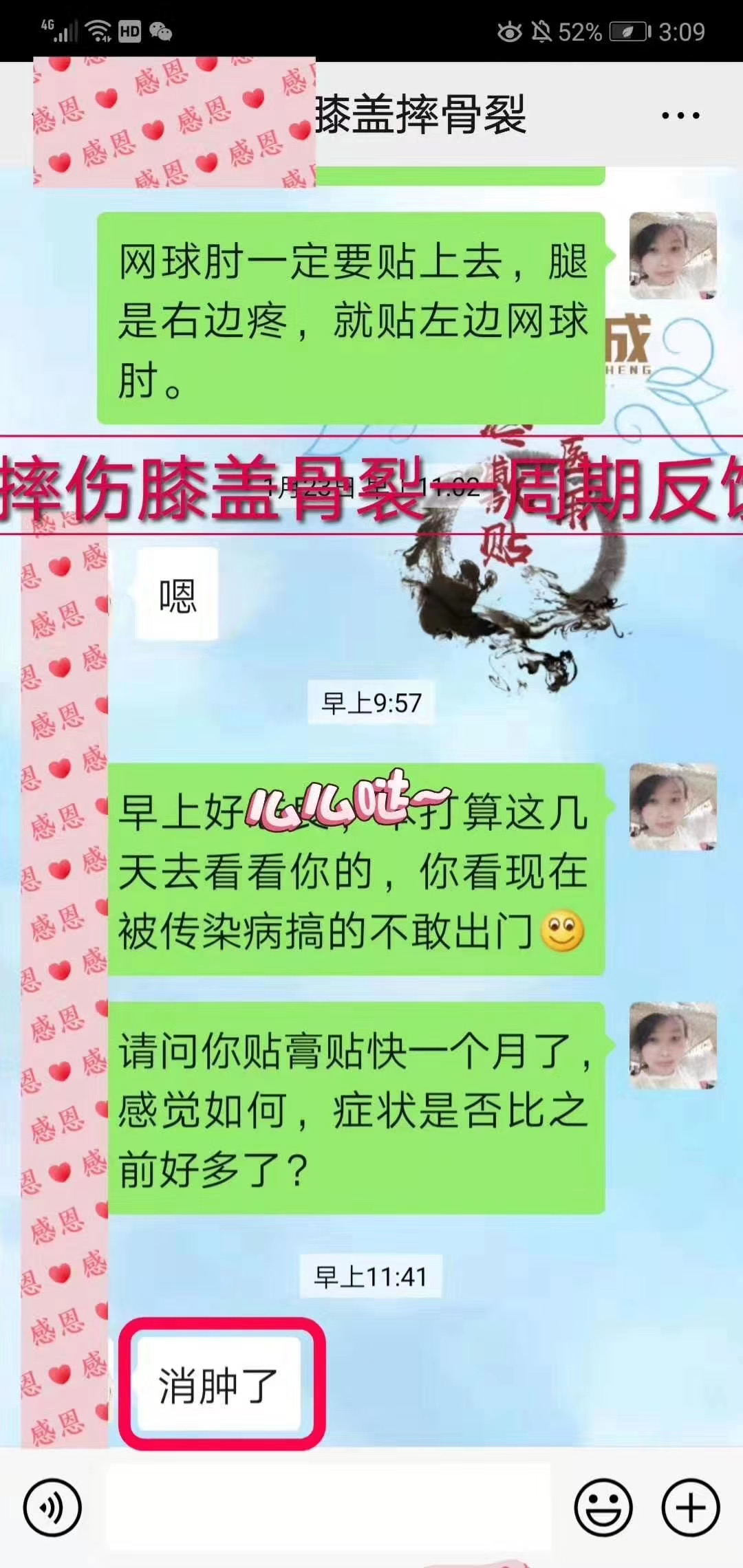 膝盖骨折反馈 这位顾客是40多天前摔伤膝盖,肿胀疼痛明显,敷贴术方天成第4天明显消肿了,疼痛比之前减轻
