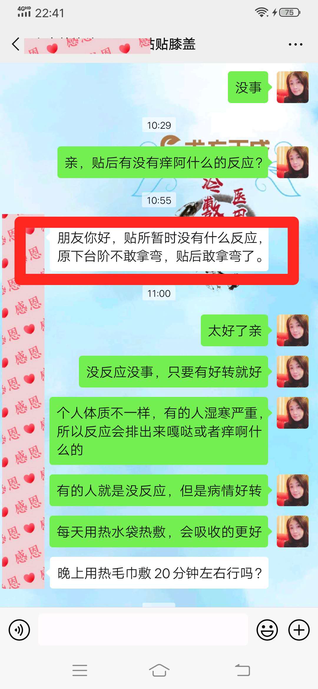 膝盖老伤反馈 大姐多年老伤膝盖骨节疼,才贴术方天成三天,原来下台阶不敢拿弯,贴后敢拿弯了