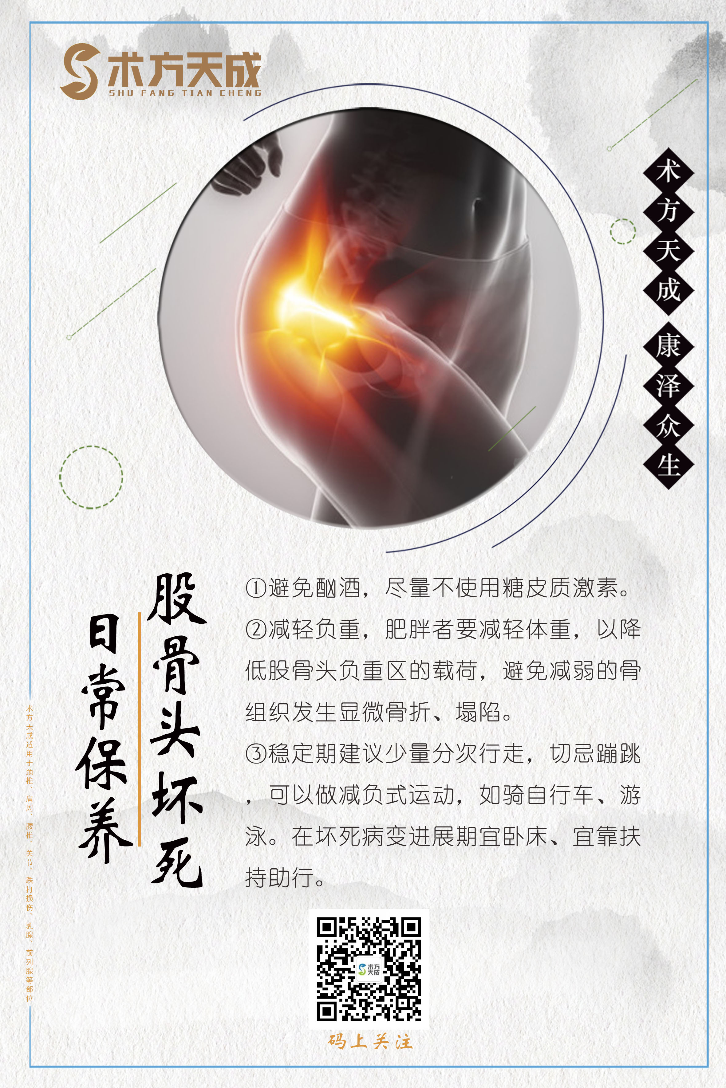术方天成 康泽众生 为您分享股骨头坏死日常保养