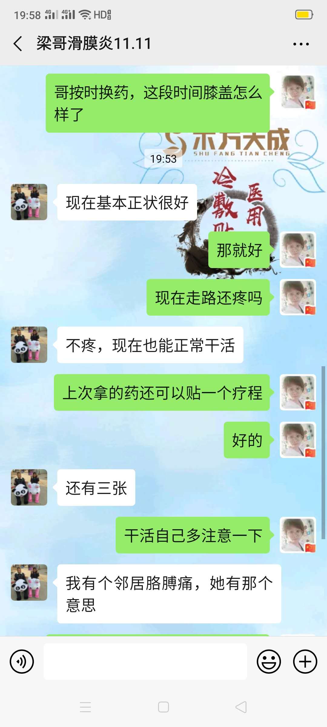 滑膜炎反馈 这位大哥来调理时拄拐杖,膝盖疼痛肿胀准备要做手术,拿了五十贴术方天成坚持使用,回访说:不疼了,已经可以正常干活了