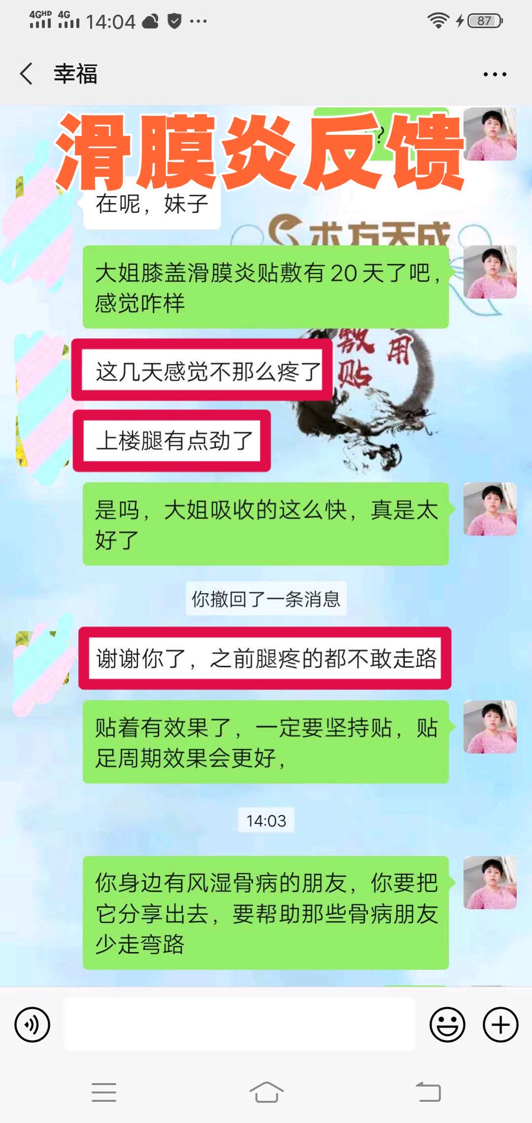 滑膜炎反馈 大姐滑膜炎10多年了,贴敷术方天成20天,感觉不那么疼了,上楼腿有劲了