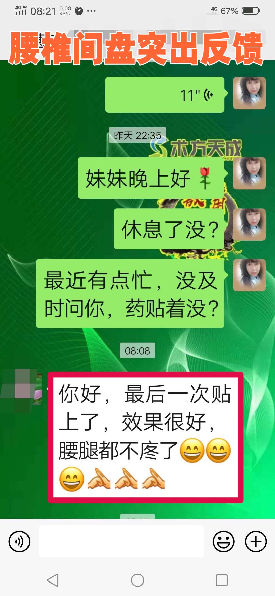 腰椎间盘突出反馈 顾客腰突压迫坐骨神经,腰痛、腿痛、麻木,贴敷术方天成两次时腿不麻了,贴敷二个周期腰腿都不痛了