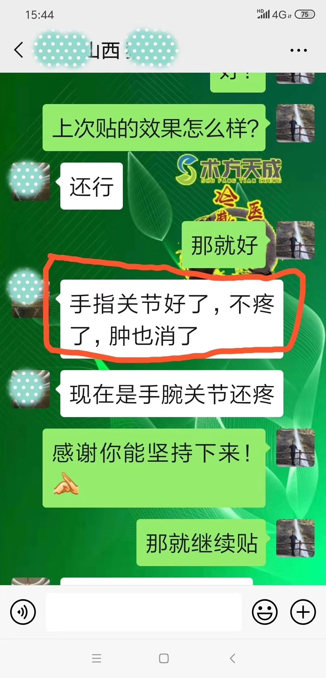 类风湿性关节炎反馈 阿姨类风湿全身关节疼痛难忍,整晚睡不着,孝顺的女儿抱着试一试的态度给妈妈买术方天成敷贴,高兴的跟代理报喜:轻松多了,贴的地方有所好转