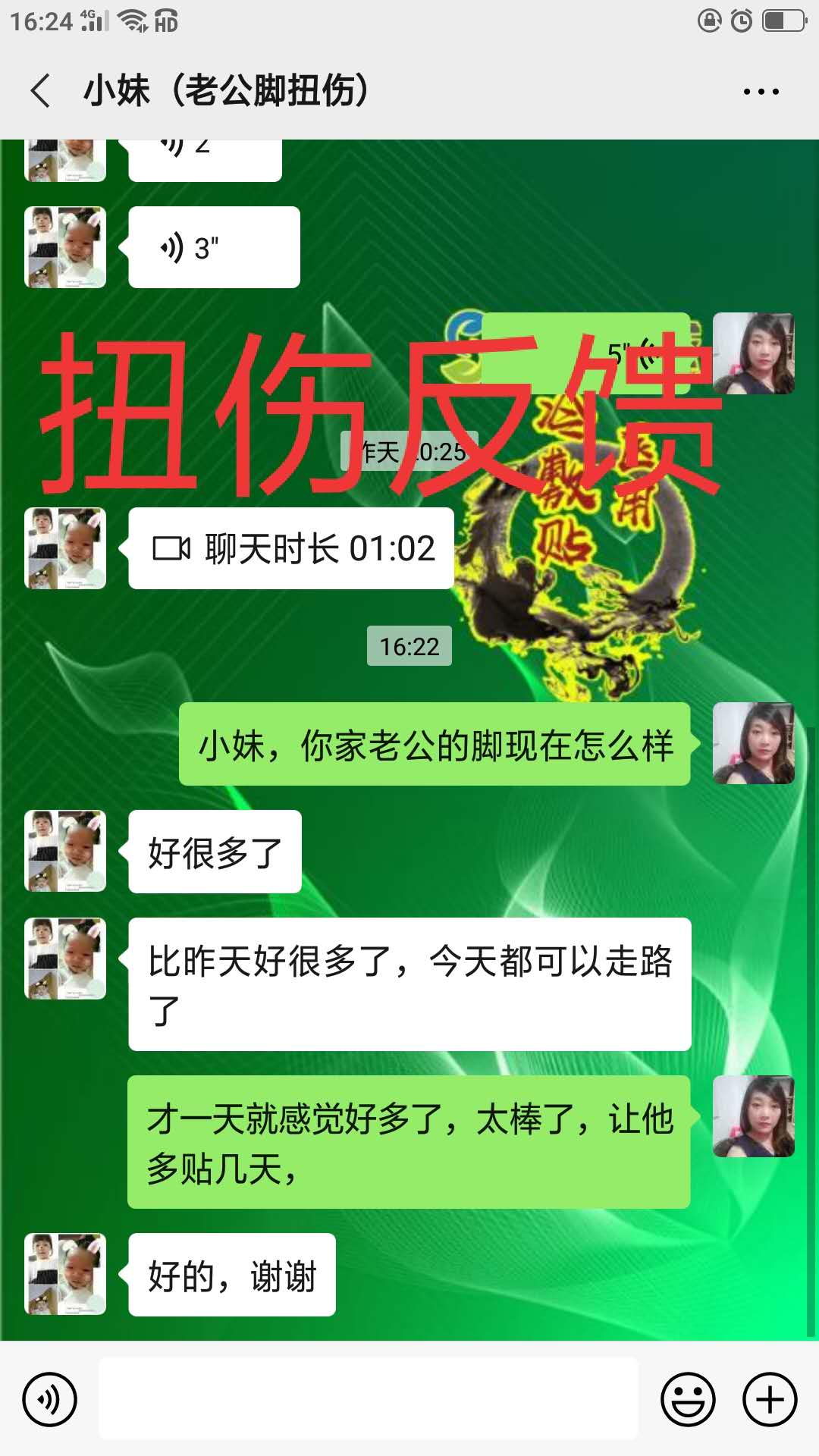 脚扭伤反馈 顾客脚扭伤贴上术方天成,才一天感觉好多了,可以下地走路了
