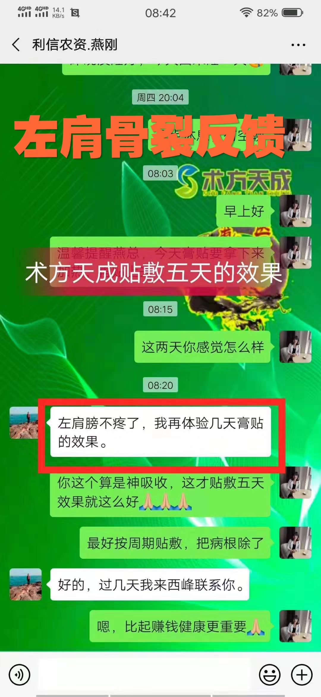 肩部骨裂反馈 顾客左肩部骨裂,贴敷术方天成第五天说肩膀不疼了