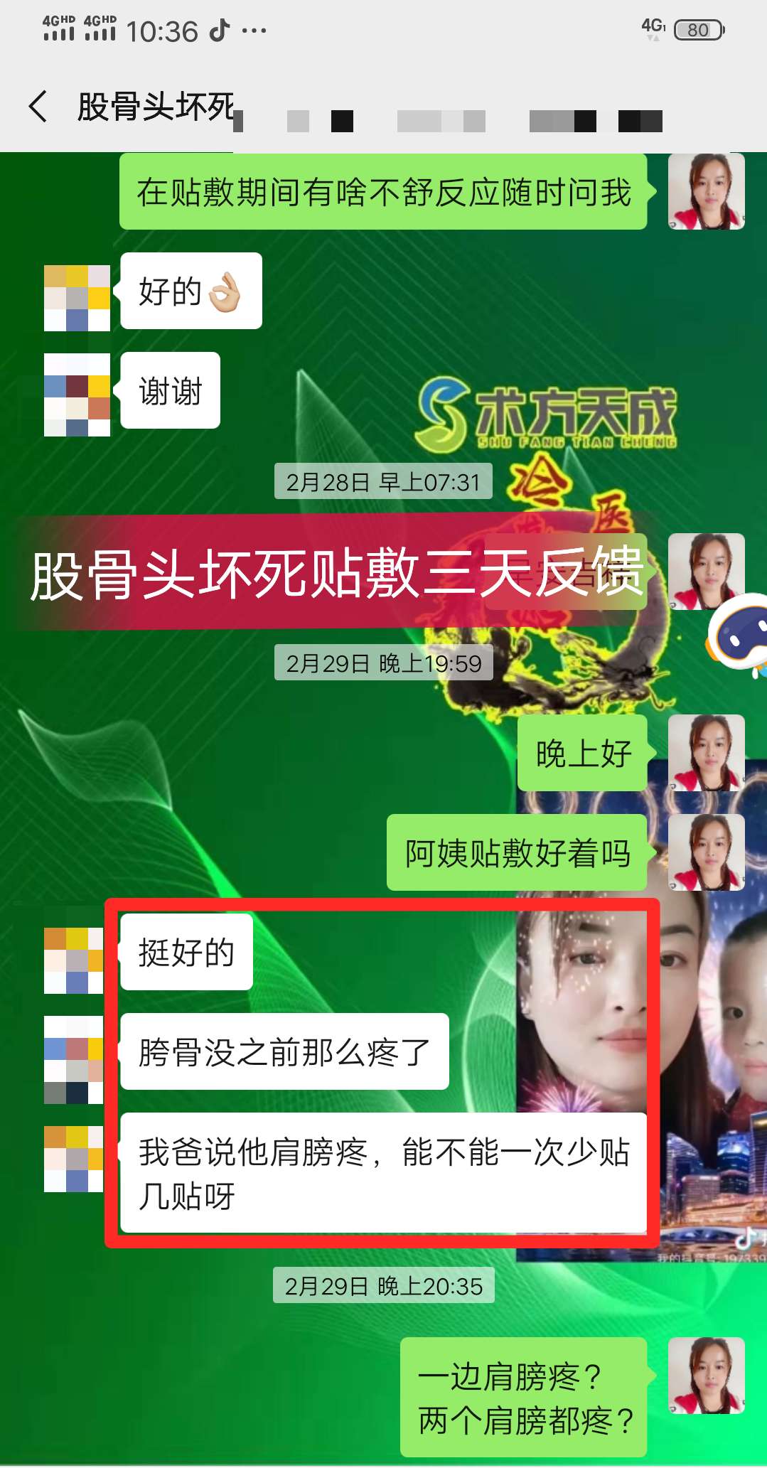 股骨头坏死反馈 才贴术方天成三天,美女的妈妈胯骨就没那么疼了,说咱术方天成挺好的