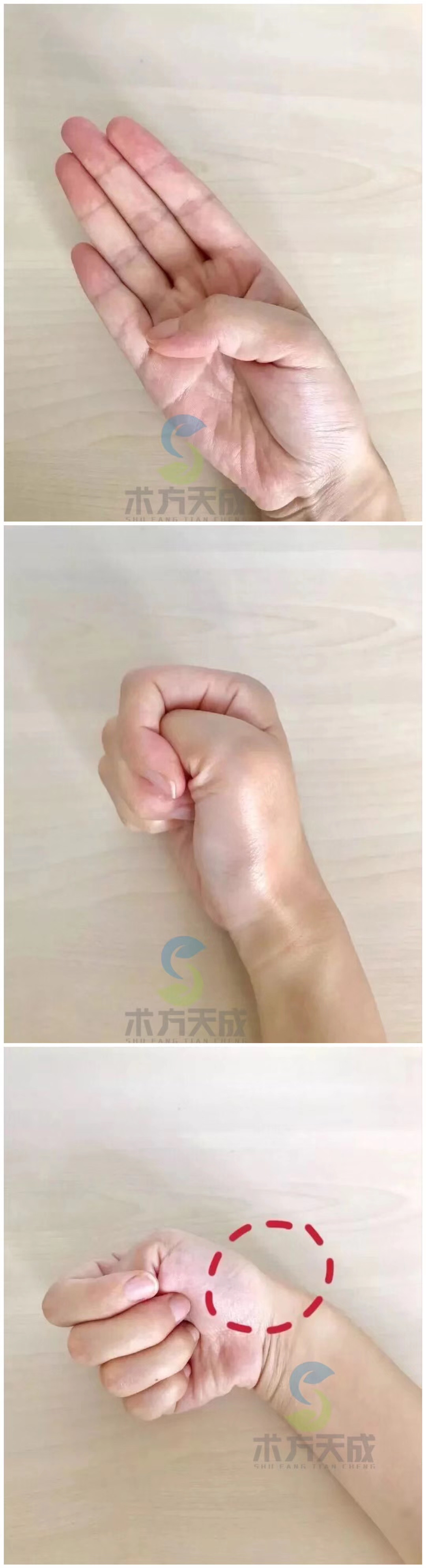 是否患有腱鞘炎? 胳膊伸直跟我一起来做测试吧: 第一步:大拇指放在小指的根部。 第二步:整只手折起来握住。 第三步:手腕向小指方向折。 如果你在折的时候感觉到很疼,就要引起重视喽。