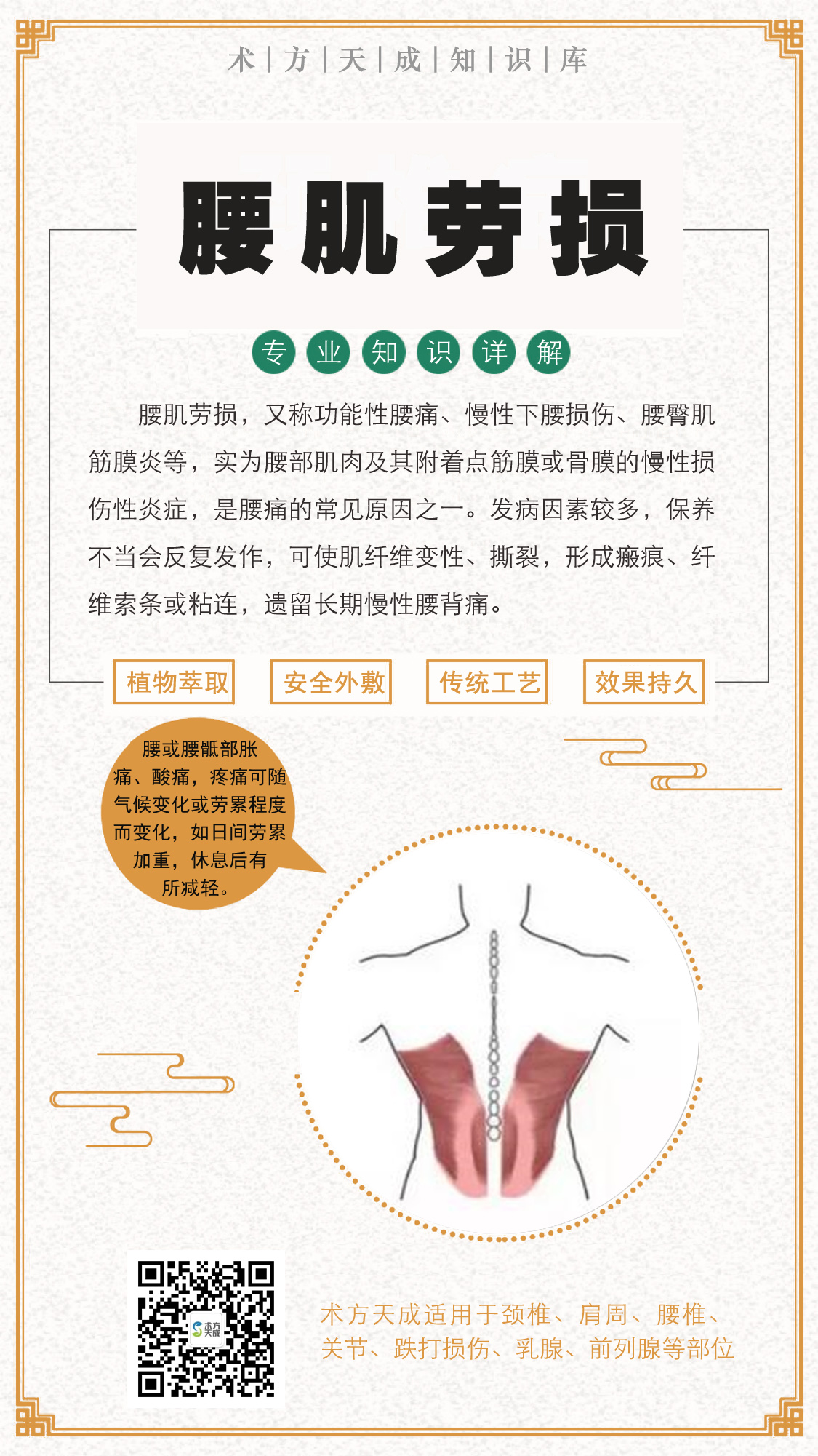 腰肌劳损反复发作 术方天成为您解忧 腰肌劳损以腰部隐痛、反复发作、劳累后加重为主要表现。因腰部肌肉、韧带等软组织损伤导致疼痛,好发于30~50岁的中青年人,可表现出腰部疼痛及活动受限。