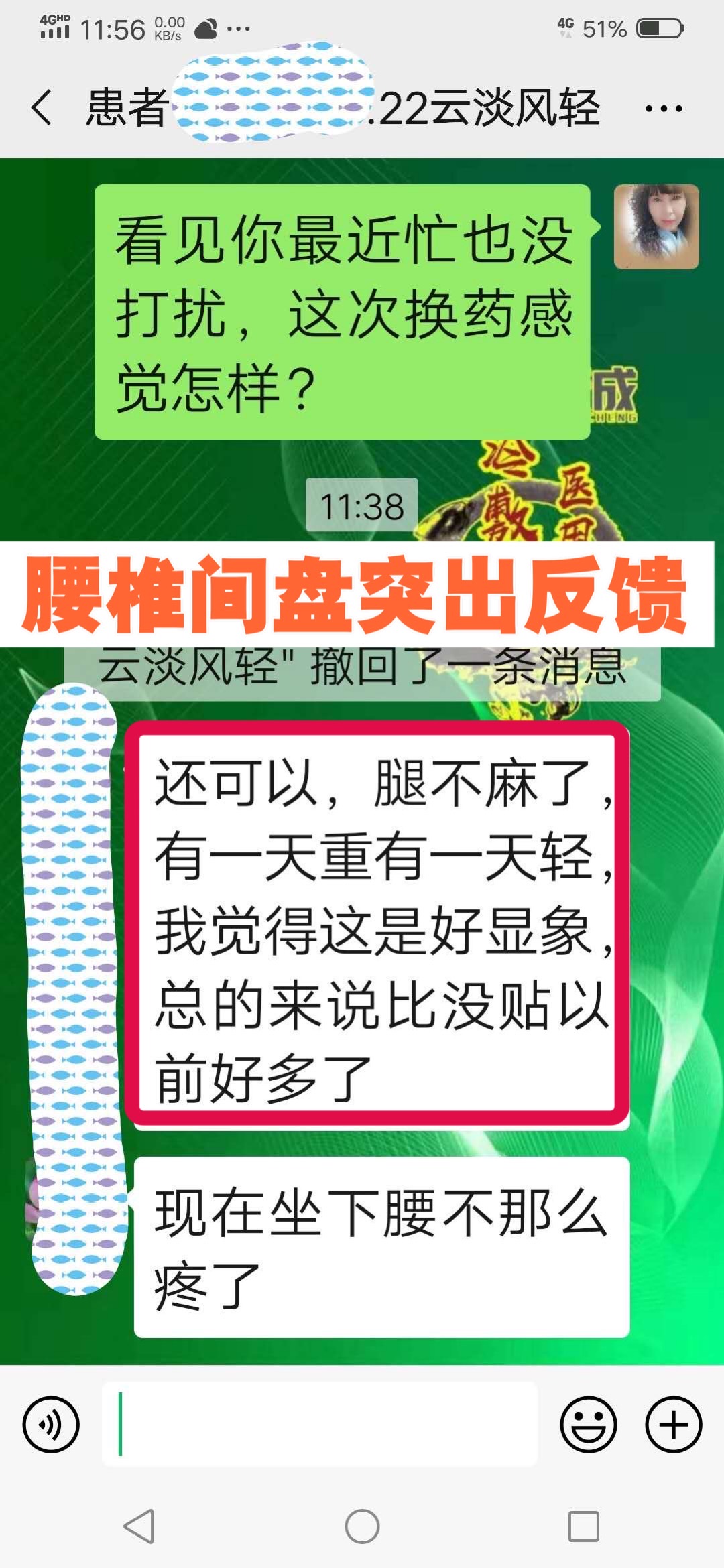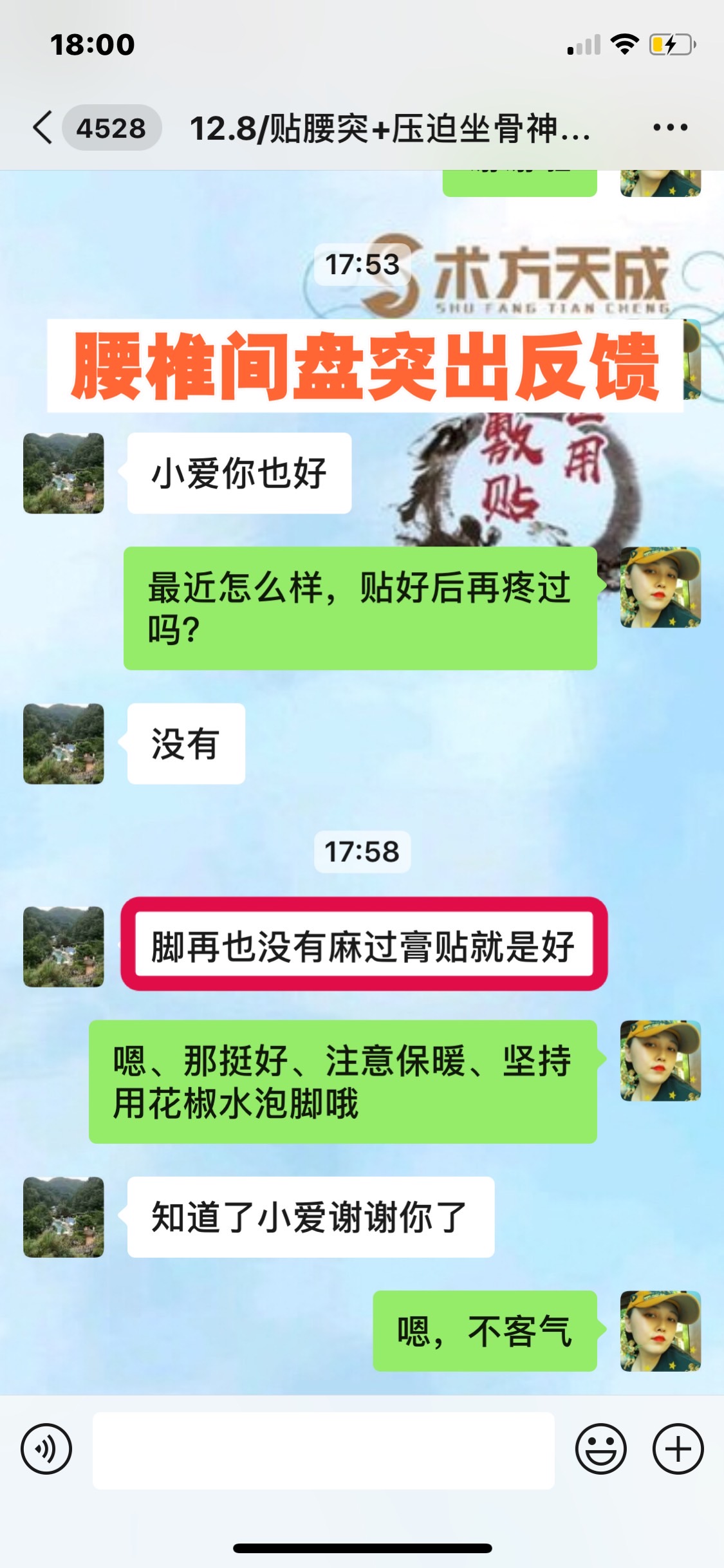 腰椎间盘突出反馈 这位顾客腰突压迫坐骨神经,贴敷术方天成一个周期,腿不麻了,坐下腰也不怎么疼了