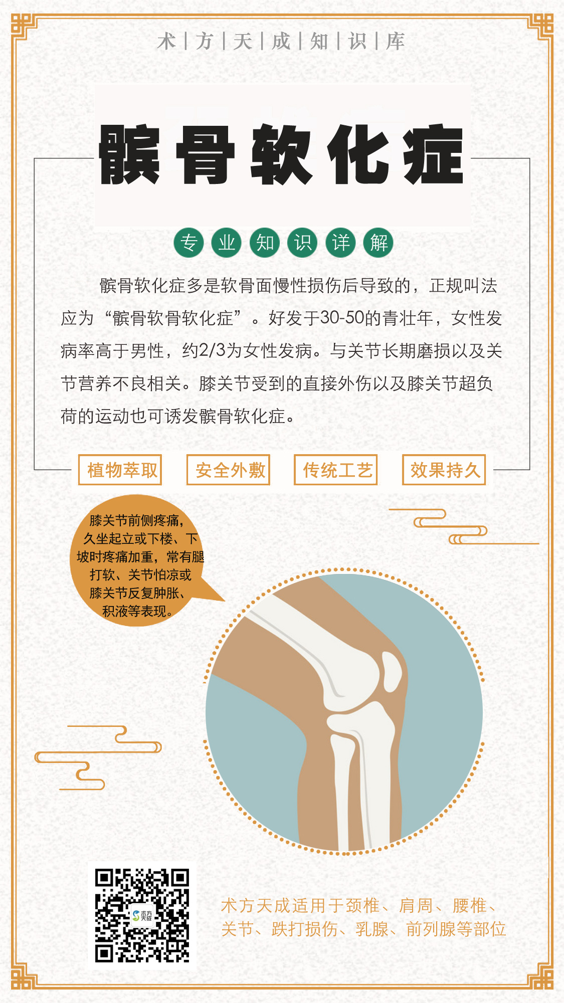 髌骨软骨软化症 疼痛肿胀腿打软 髌骨软化症多是软骨面慢性损伤后导致的,正规叫法应为“髌骨软骨软化症”。主要表现包括软骨肿胀、碎裂、脱落,继而股骨髁的对应部位也发生同样病变,最终出现髌骨关节骨性关节炎。