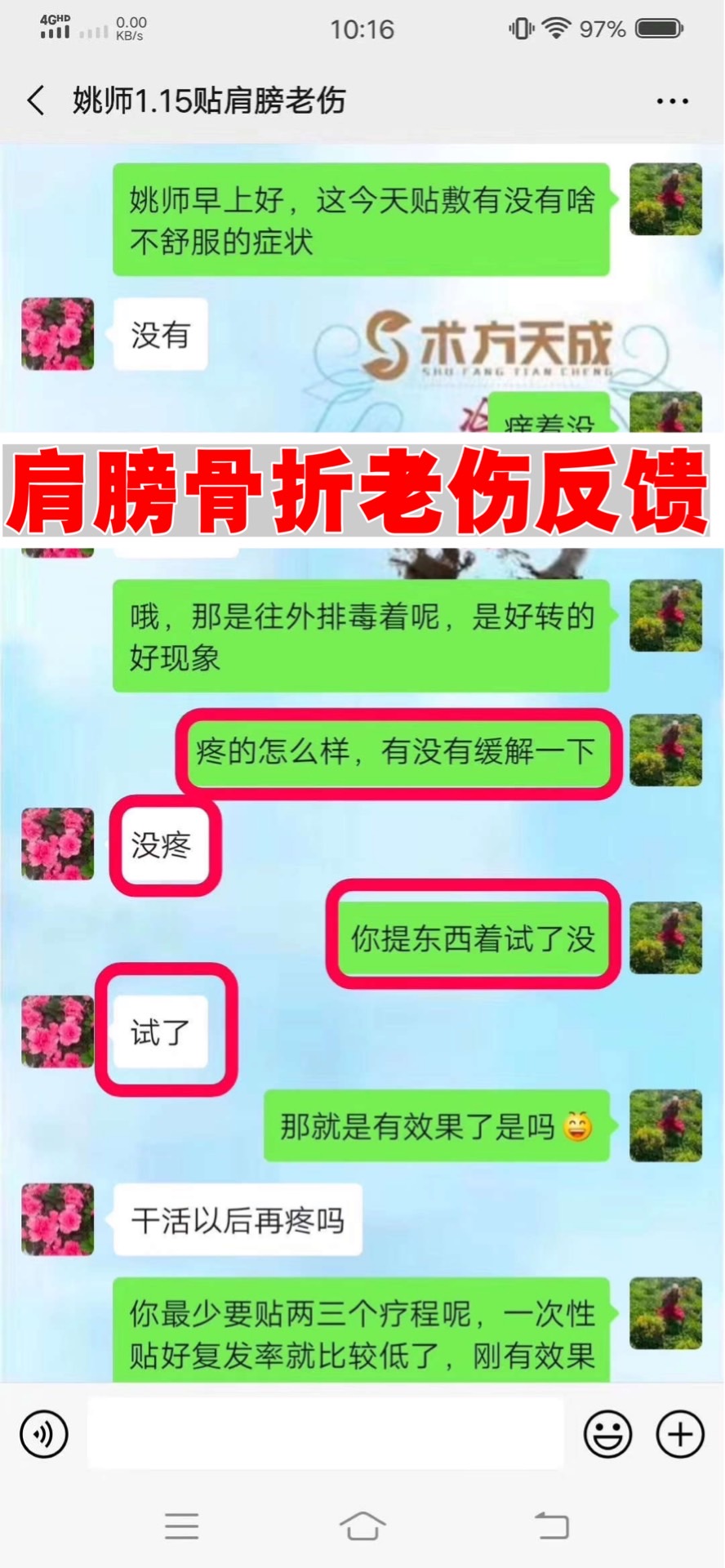肩膀骨折老伤反馈 这位顾客10多 年前肩膀受伤骨 折,用过不少方法效果都不太好,贴术方天成天 就说不 疼了!
