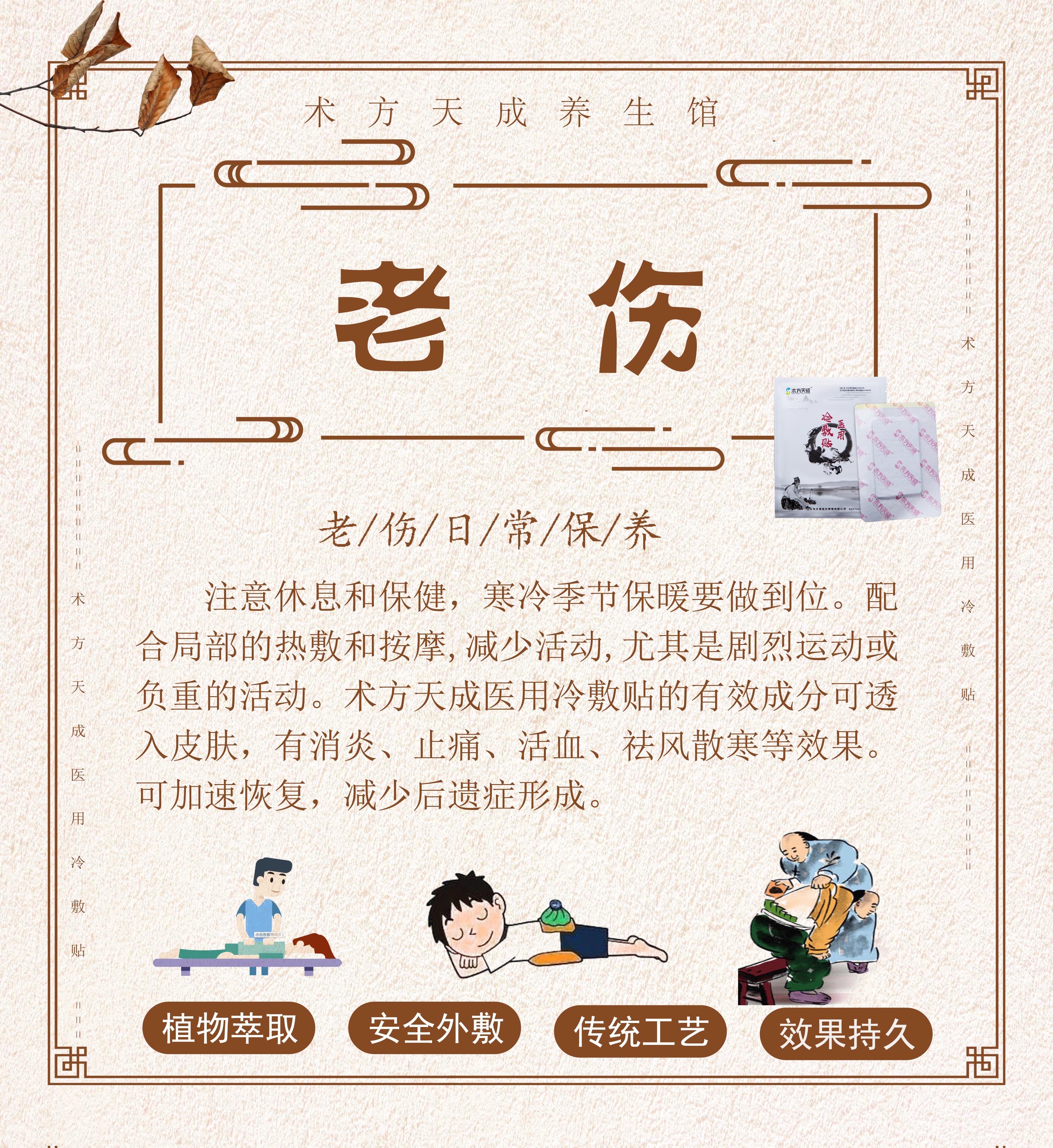 【术方天成医用冷敷贴·适用人群】 长期久坐者:如司机、办公室文员 长期站立者:如交警、医生、导购 膝盖长期裸露者:如运动员、模特 户外负重工作者:如搬运工、装卸工 运动后遗症者:如体育锻炼爱好者 颈肩腰腿痛者:如中老年人、筋骨损伤者 术方天成医用冷敷贴,痛点+穴位,直达根源,促进血液循环,袪湿散寒,快速调理你的各部位关节疼痛