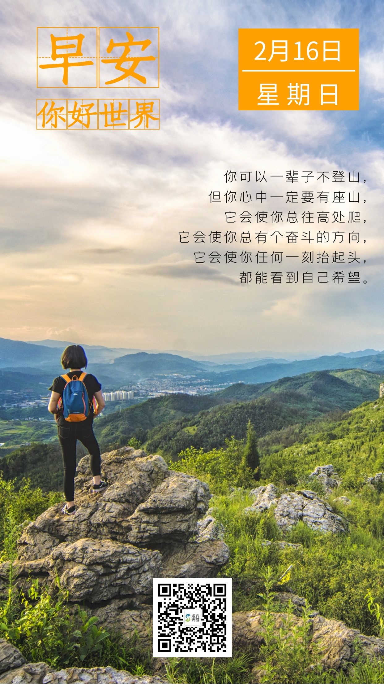 你可以一辈子不登山, 但你心中一定要有座山, 它会使你总往高处爬, 它会使你总有个奋斗的方向, 它会使你任何一刻抬起头, 都能看到自己希望。 早安~