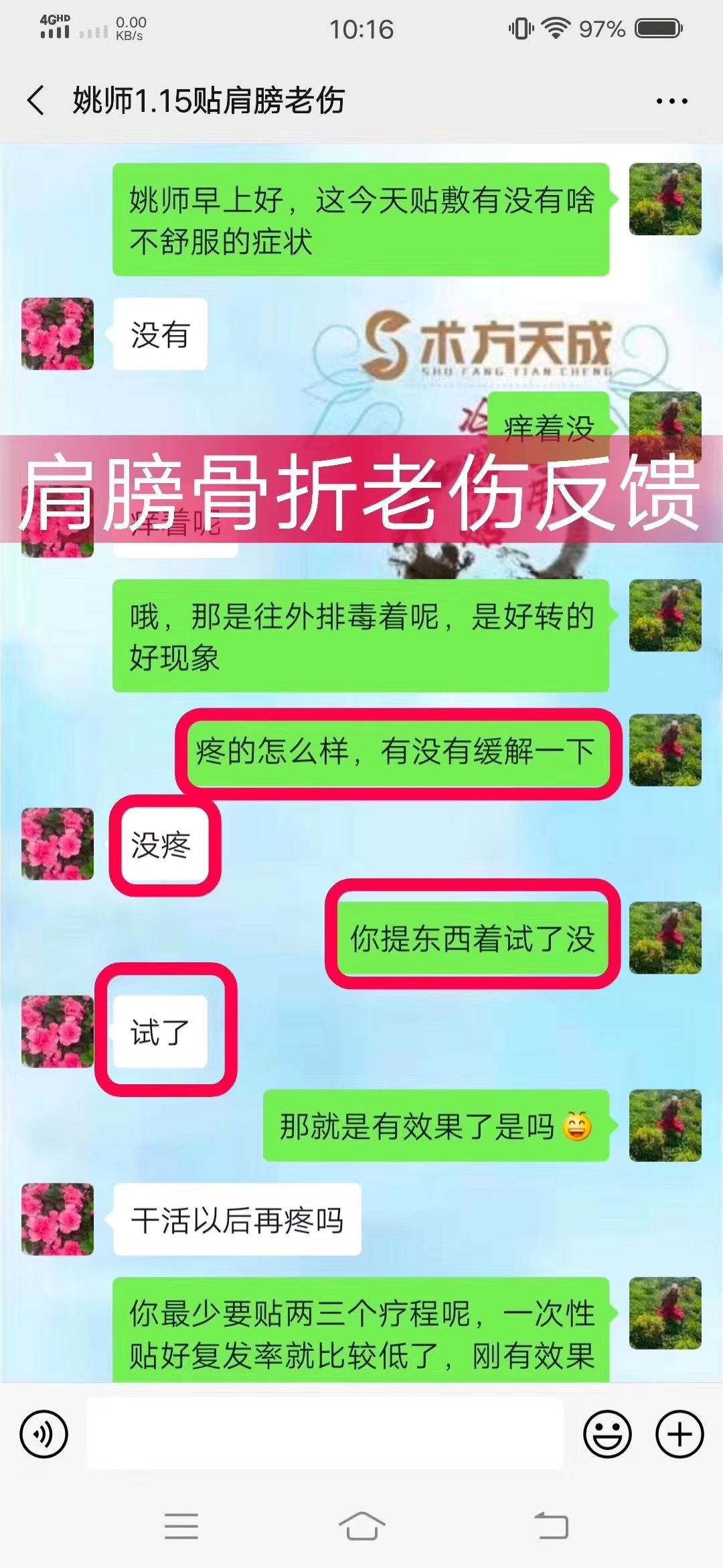 肩膀骨折老伤反馈 这位顾客10多 年前肩膀受伤骨 折,用过不少方法效果都不太好,贴术方天成天 就说不 疼了!