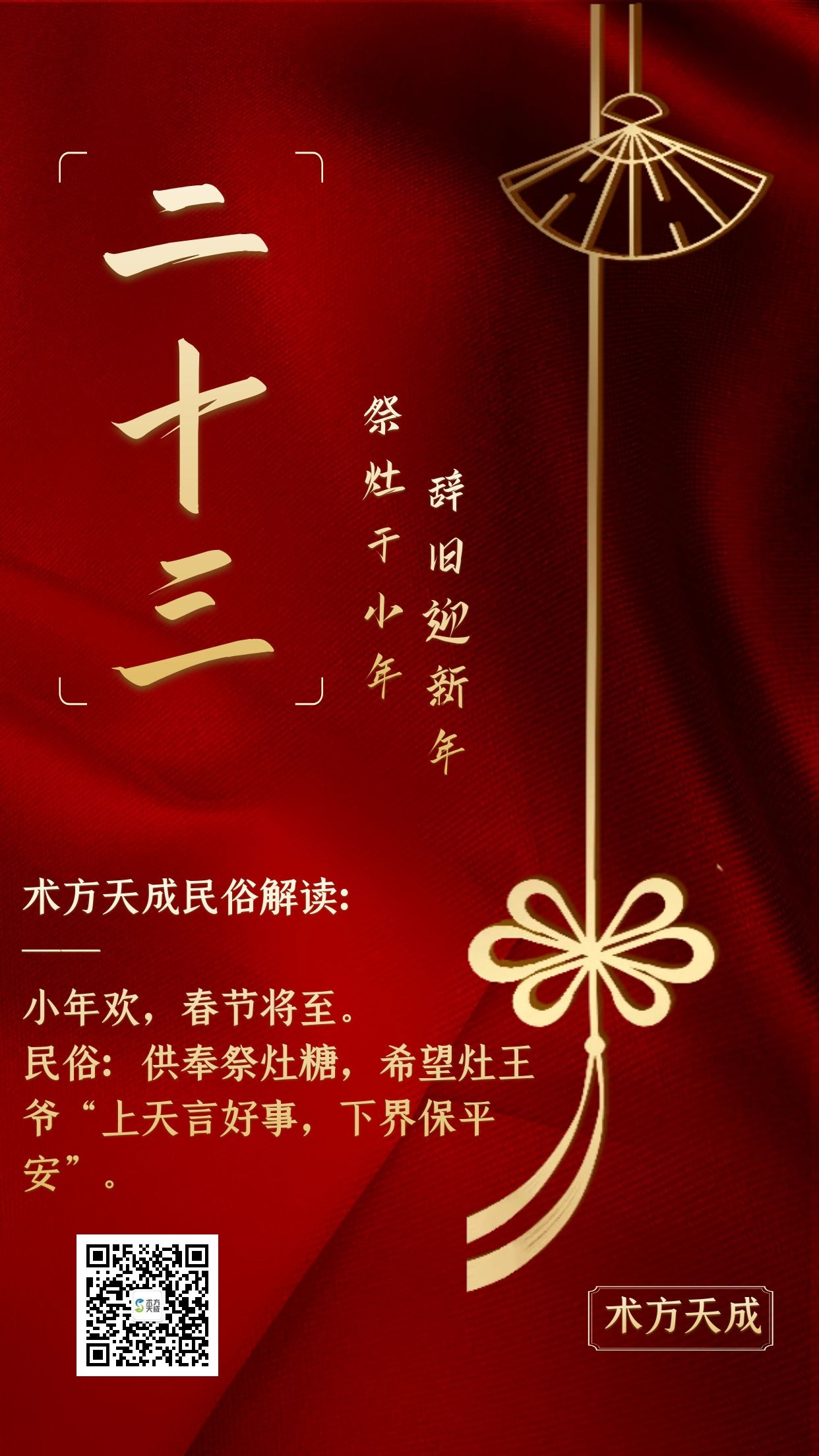 祭灶于小年 辞旧迎新春 今日腊月二十三~小年 小年通常被视为忙年的开始,意味着人们开始准备年货、扫尘、祭灶等,准备干干净净过个好年,表达了人们一种辞旧迎新、迎祥纳福的美好愿望。