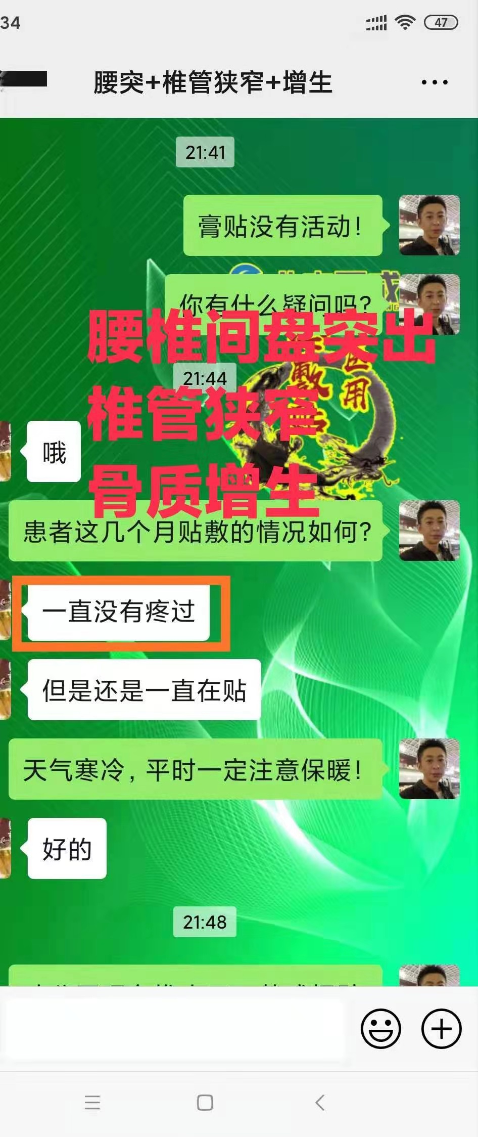腰椎间盘突出+椎管狭窄+骨质增生反馈 客户在没贴咱膏贴前,一年内反复发作两三次。贴上咱膏贴后一直没有疼过,再次回购巩固