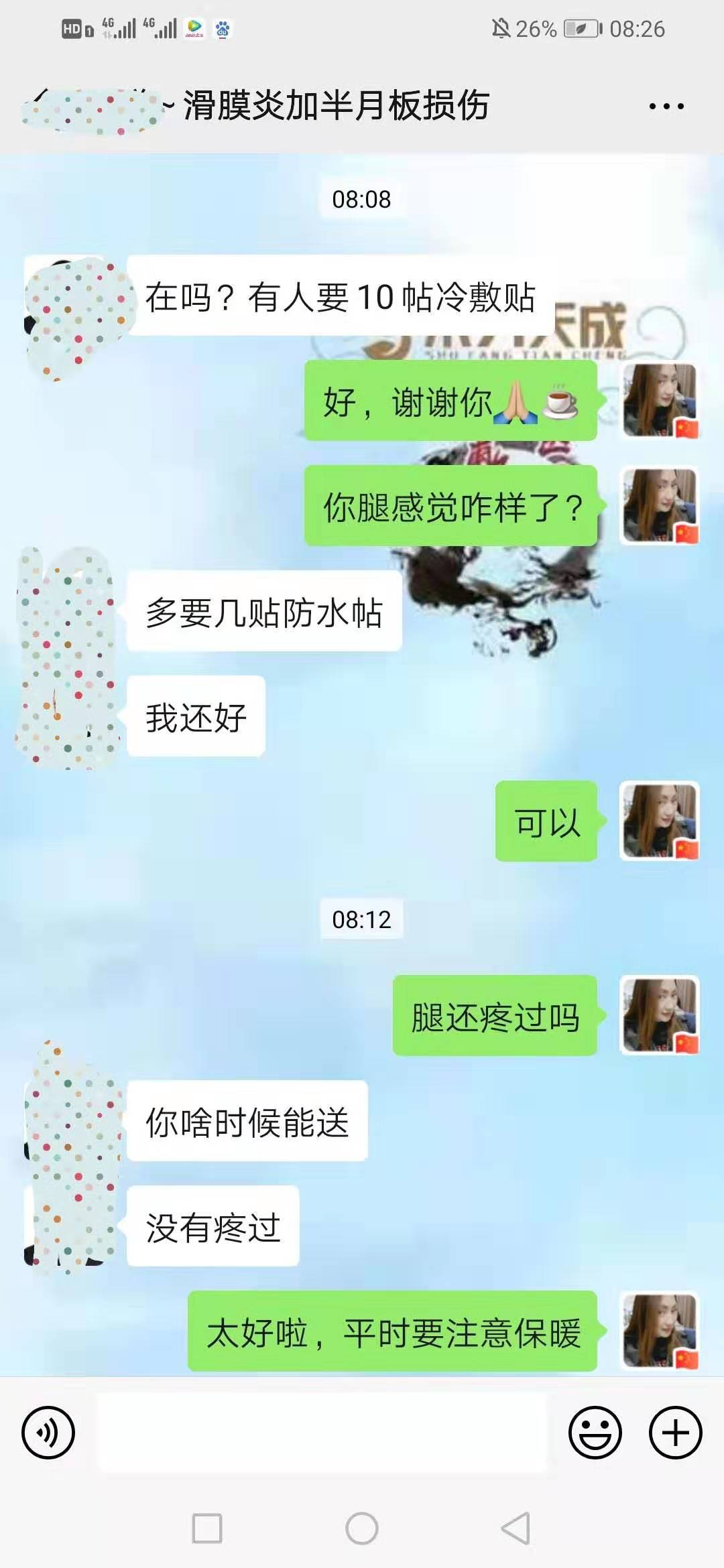 半月板损伤反馈: 顾客贴好了自己半月板损伤1年多都没犯,今天给爱人再拿10贴贴颈椎。