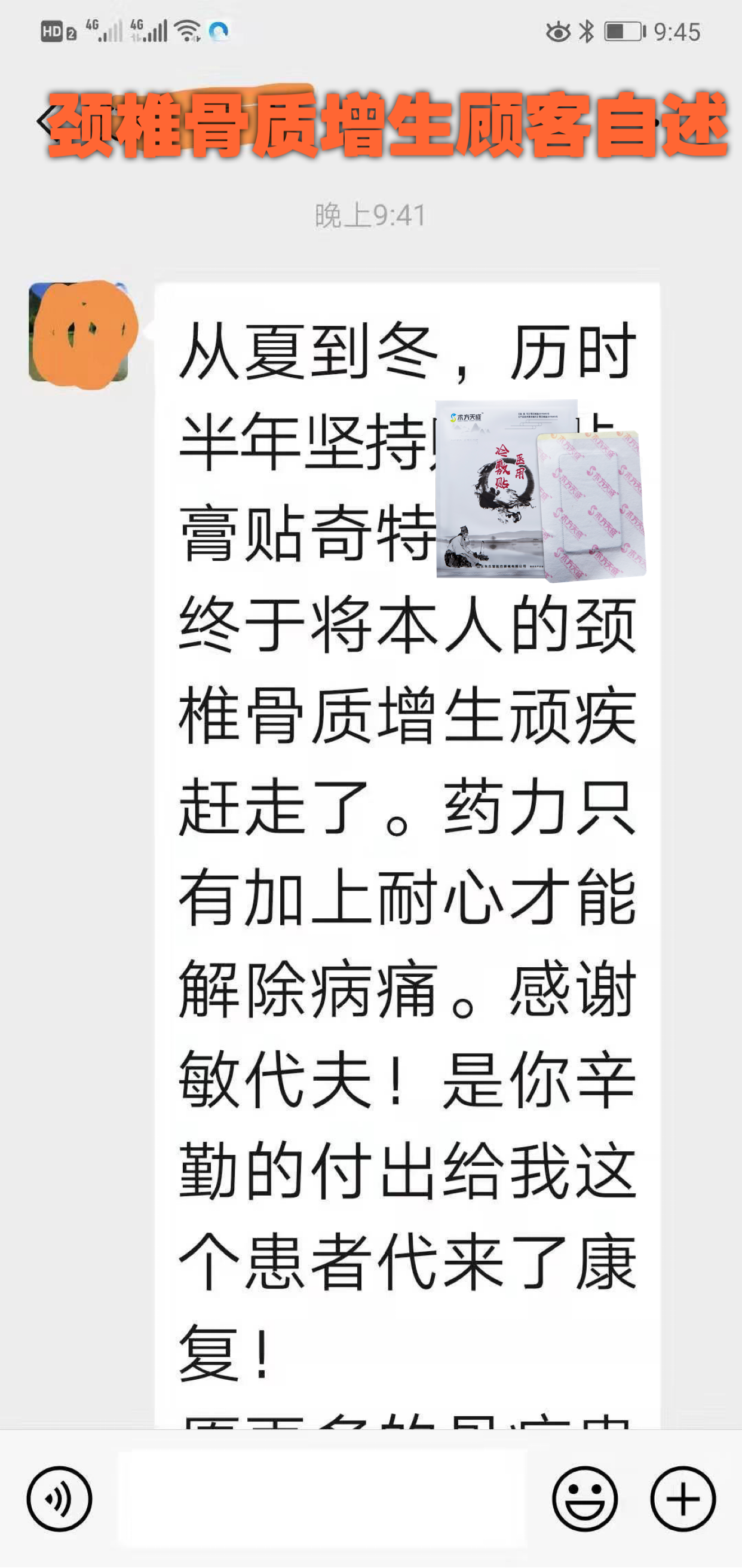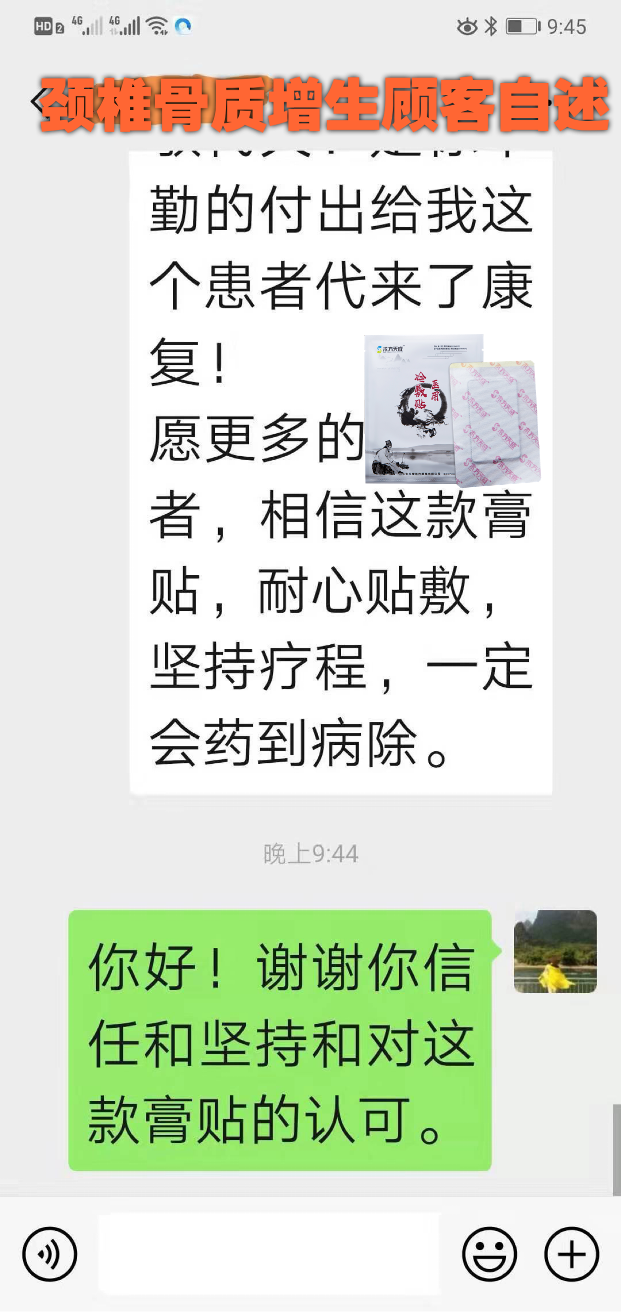 膝盖风湿痛反馈 代理的岳母风湿痛多年,尤其是天气变冷更加严重,在家里上下二楼都困难,贴敷两个周期后不疼了。好产品,让家人收获健康,受益无穷