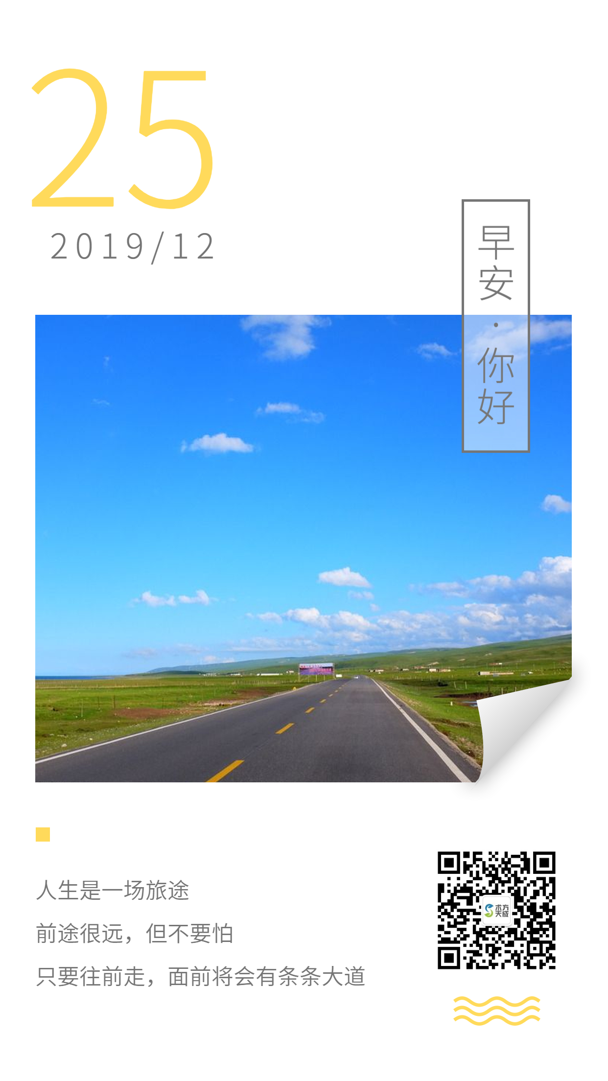 人生是一场旅途 前途很远,但不要怕 只要往前走,面前将会有条条大道 早安~