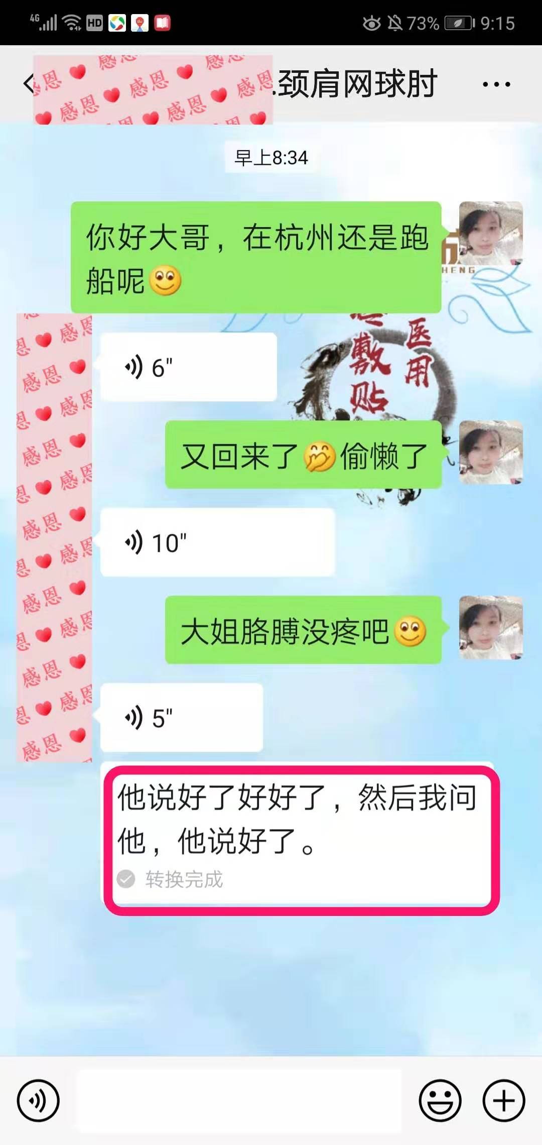 网球肘反馈 顾客大姐颈椎+肩周炎+网球肘不适敷贴术方天成,回访说:好了