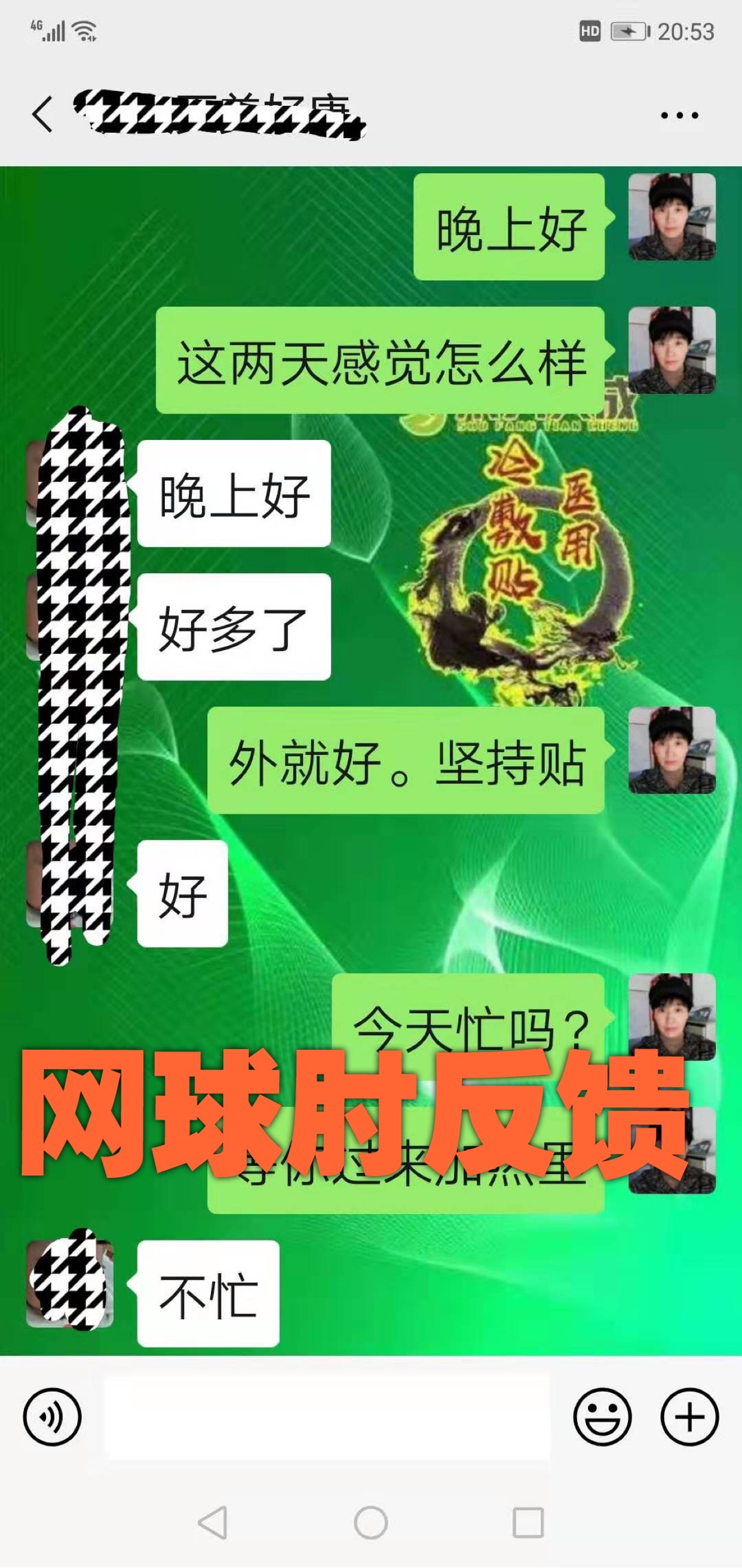网球肘反馈一次两贴术方天成,敷贴21天回访顾客时说反:好多了