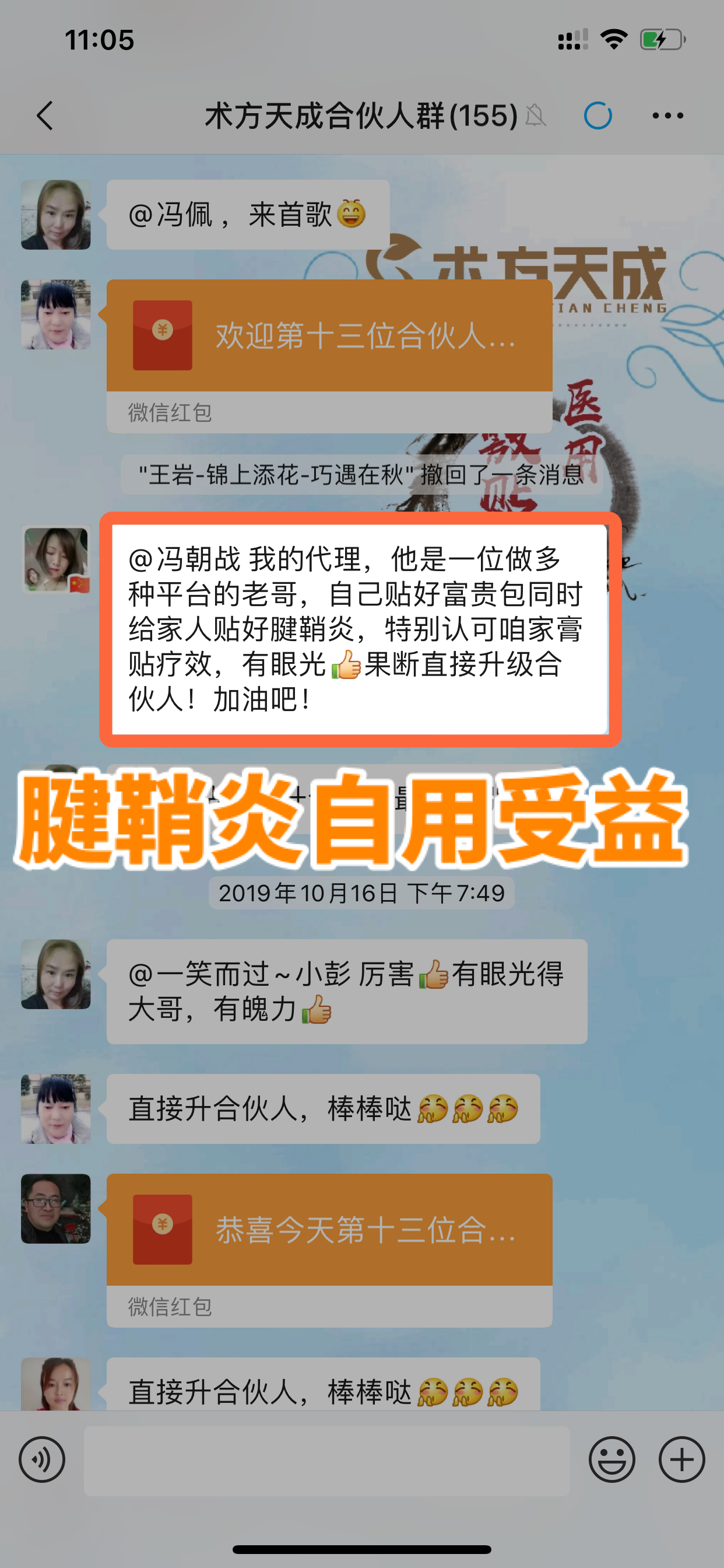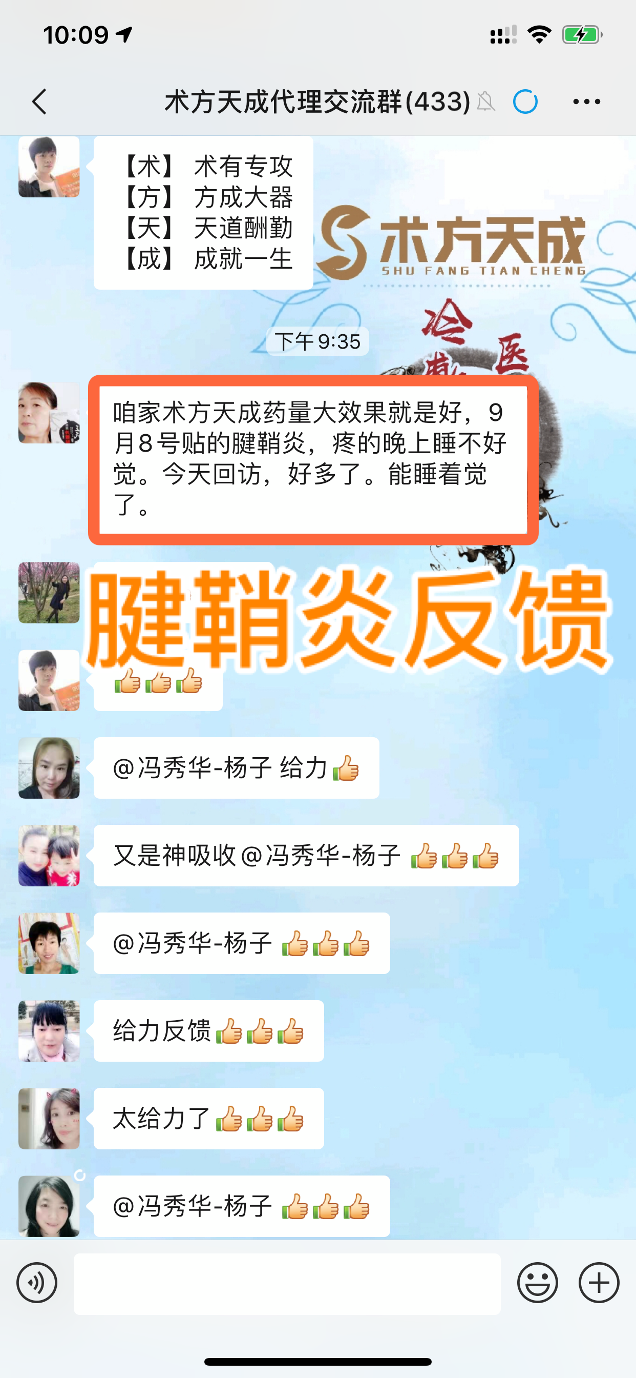 腱鞘炎反馈 无自用,不分享! 两位代理一位是贴好了自己的腱鞘炎,一位贴好了家人的腱鞘炎,咱们术方天成的经销商都是这么来的:见证效果,所以选择!