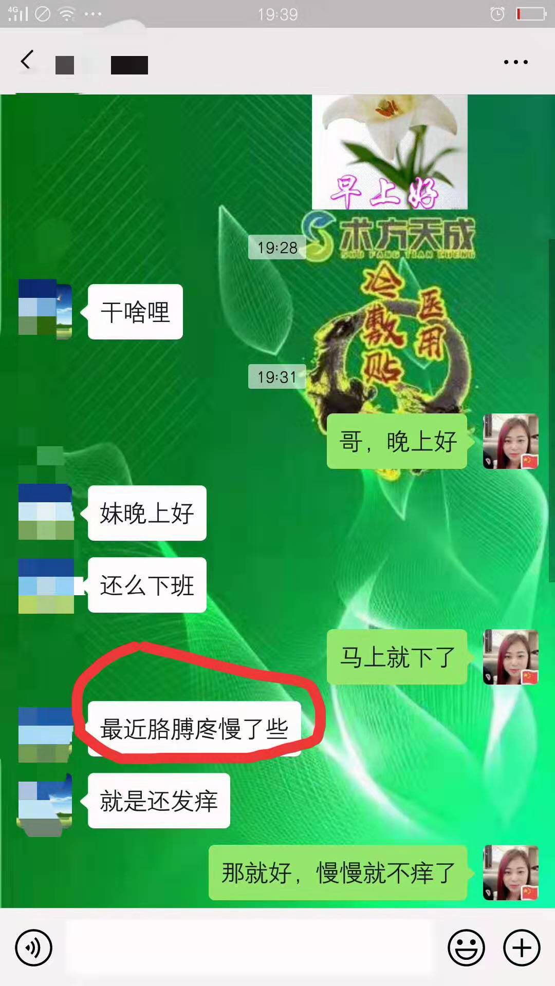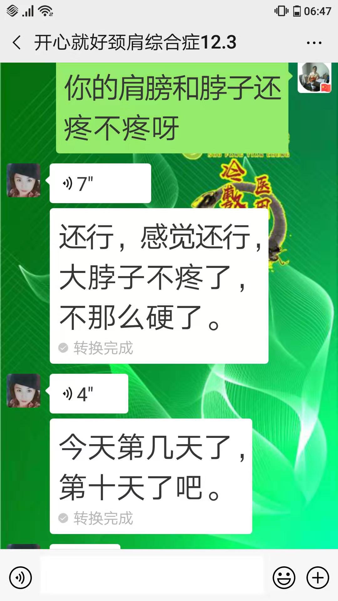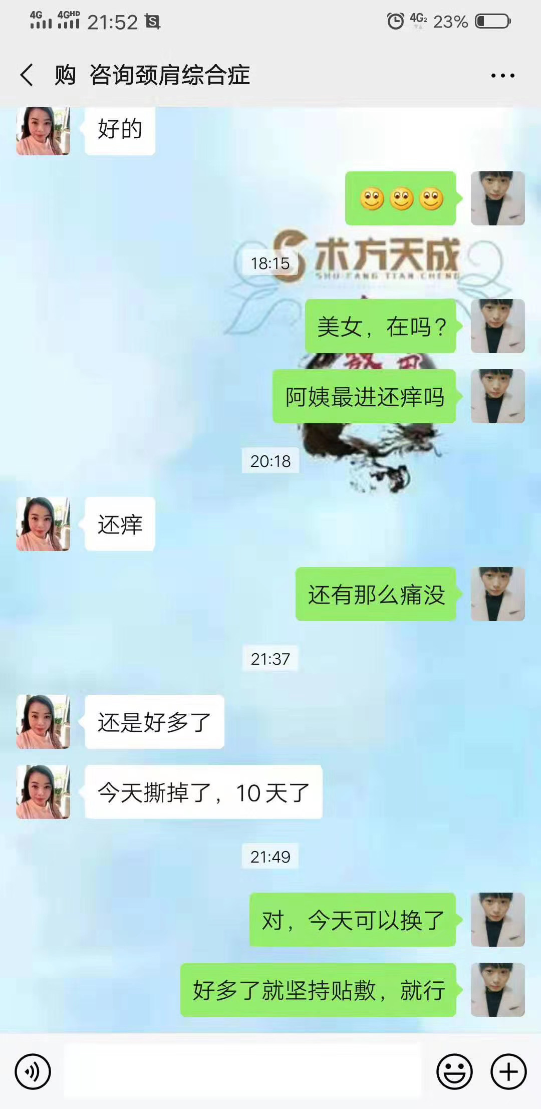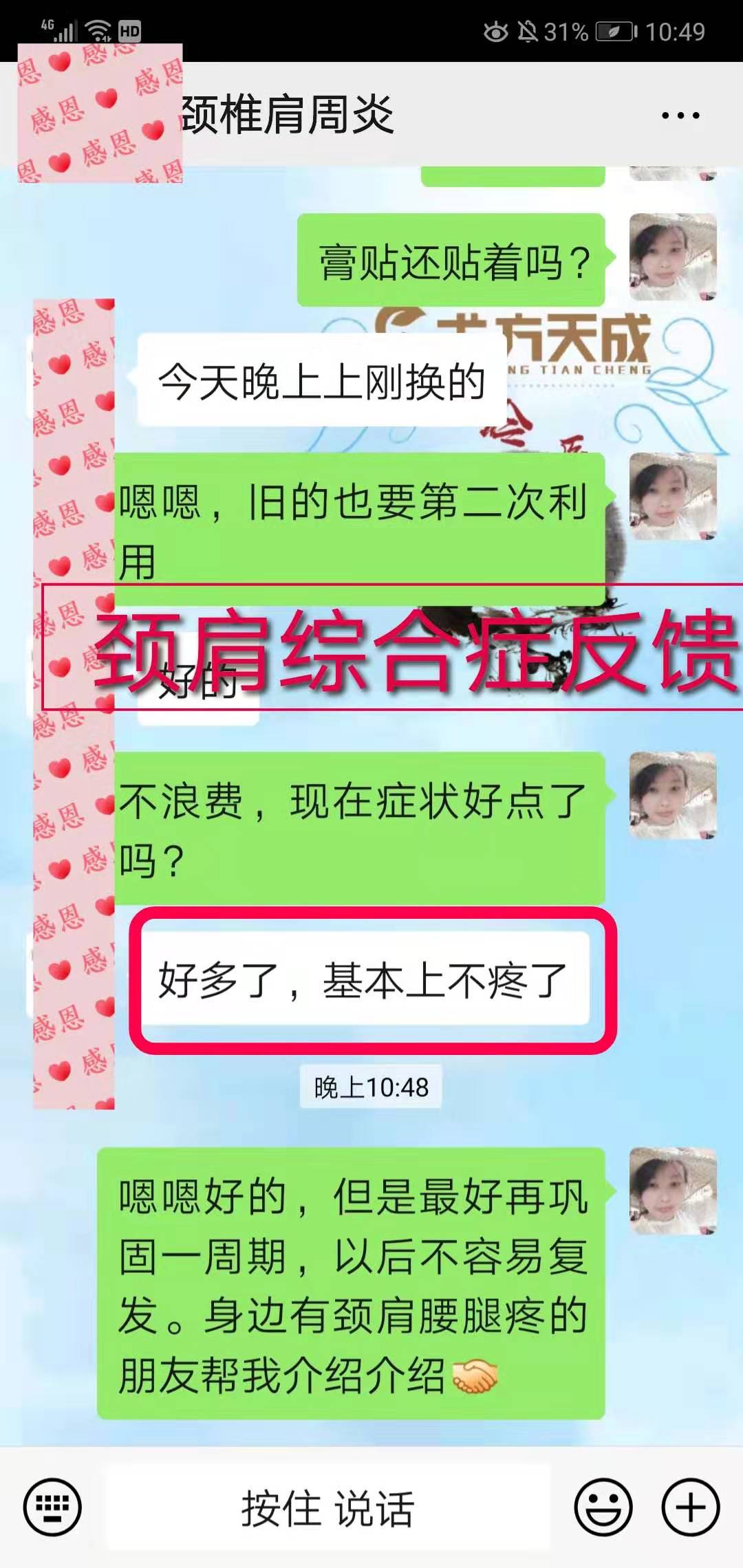 颈肩综合症反馈 这位顾客颈椎+胸椎严重不适,贴敷术方天成5天,后背不刺疼了,也不胸闷了