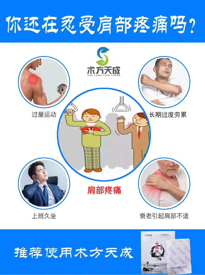 肩膀疼痛别大意术方天成来帮你肩膀不适常见原因有肩周炎、肩背部筋膜炎、肩袖损伤等,会造成肩背疼痛或肩关节活动受限。排除其他疾病所致,术方天成医用冷敷贴用于指定部位,安全方便效果好!