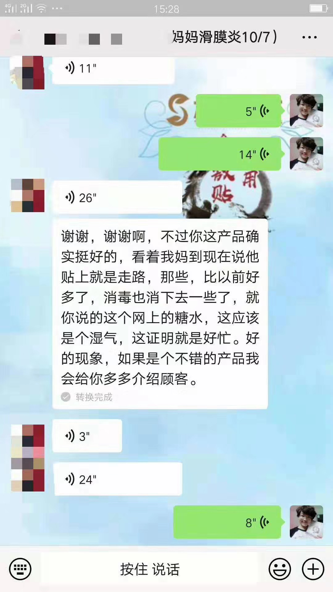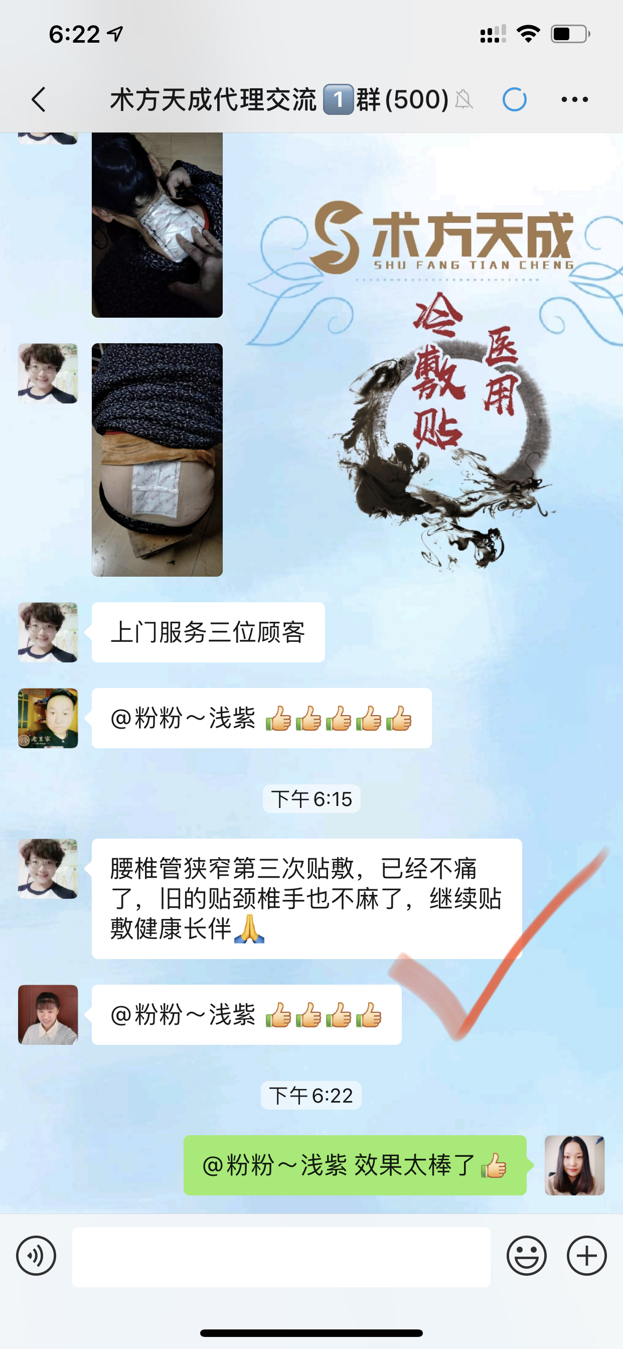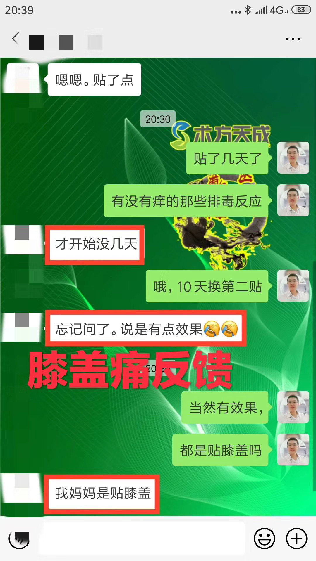 膝盖不适反馈 顾客贴膏贴之前腿站不直,膝盖不敢用力。贴完十天术方天成,腿敢站直了,有劲了[强][强][强]