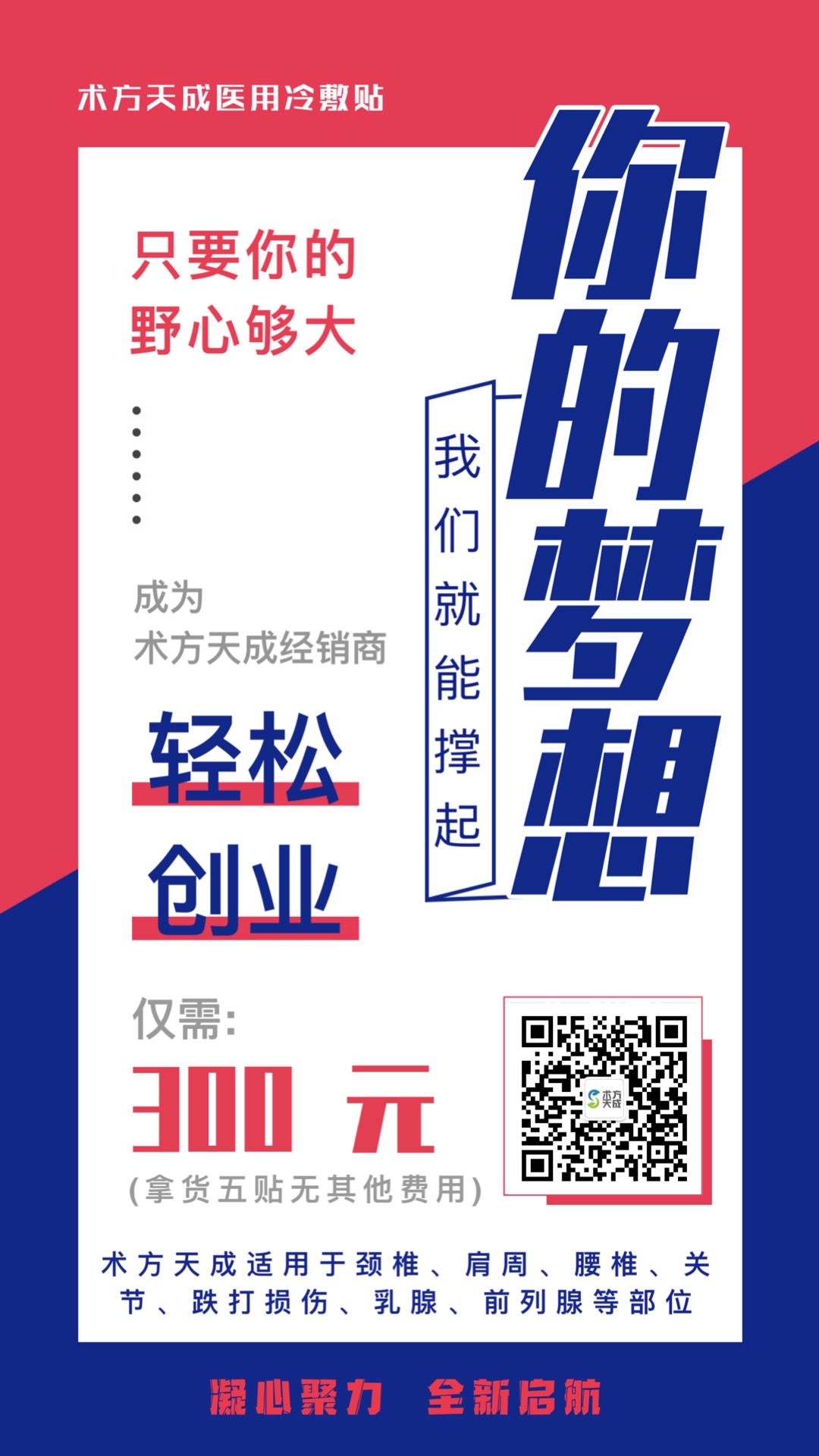 你把300当产品,她健康了你 你把300当兼职,她丰富了你 你把300当平台,她锻炼了你 你把300当学校,她塑造了你 你把300当舞台,她绽放了你 你把300当事业,她成就了你 欢迎有梦想的你加入【术方天成医用冷敷贴】大舞台