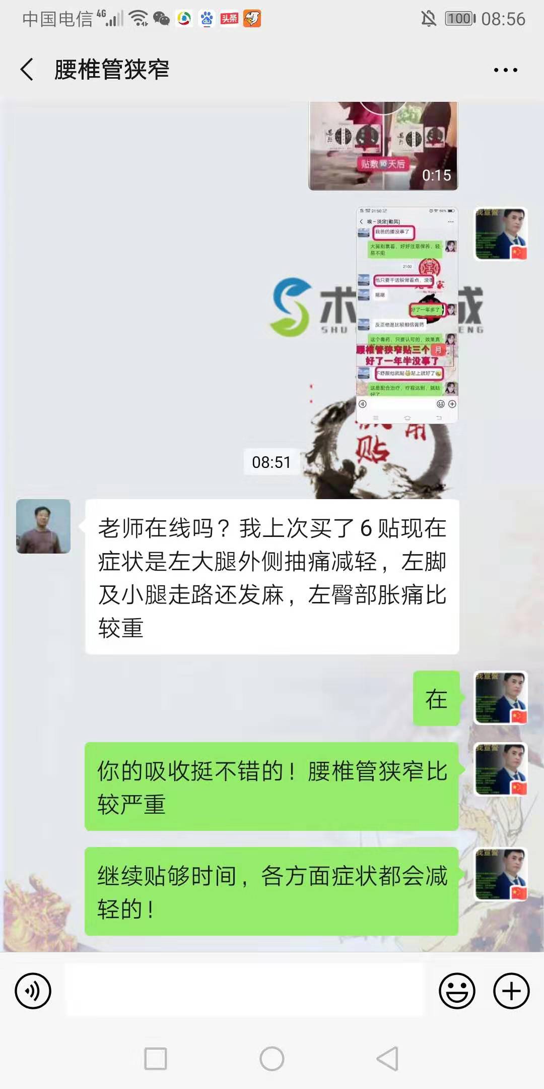 腰椎管狭窄反馈 这位大叔给腰疼走不了路的老伴买20贴膏贴去贴,一个月下来老伴可以走一小段路了,今天再回购20贴去坚持调理,希望阿姨快快好起来