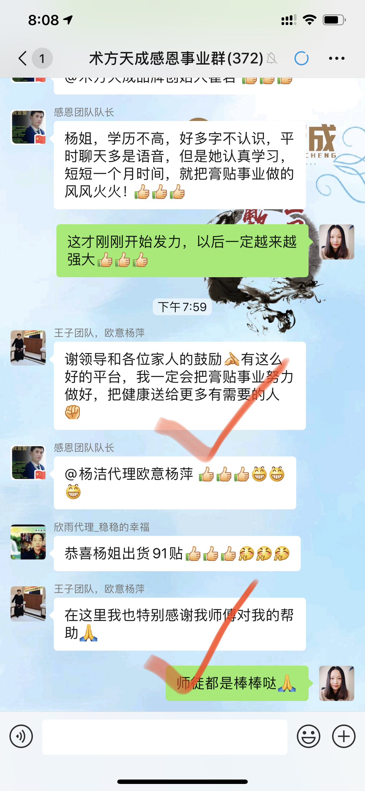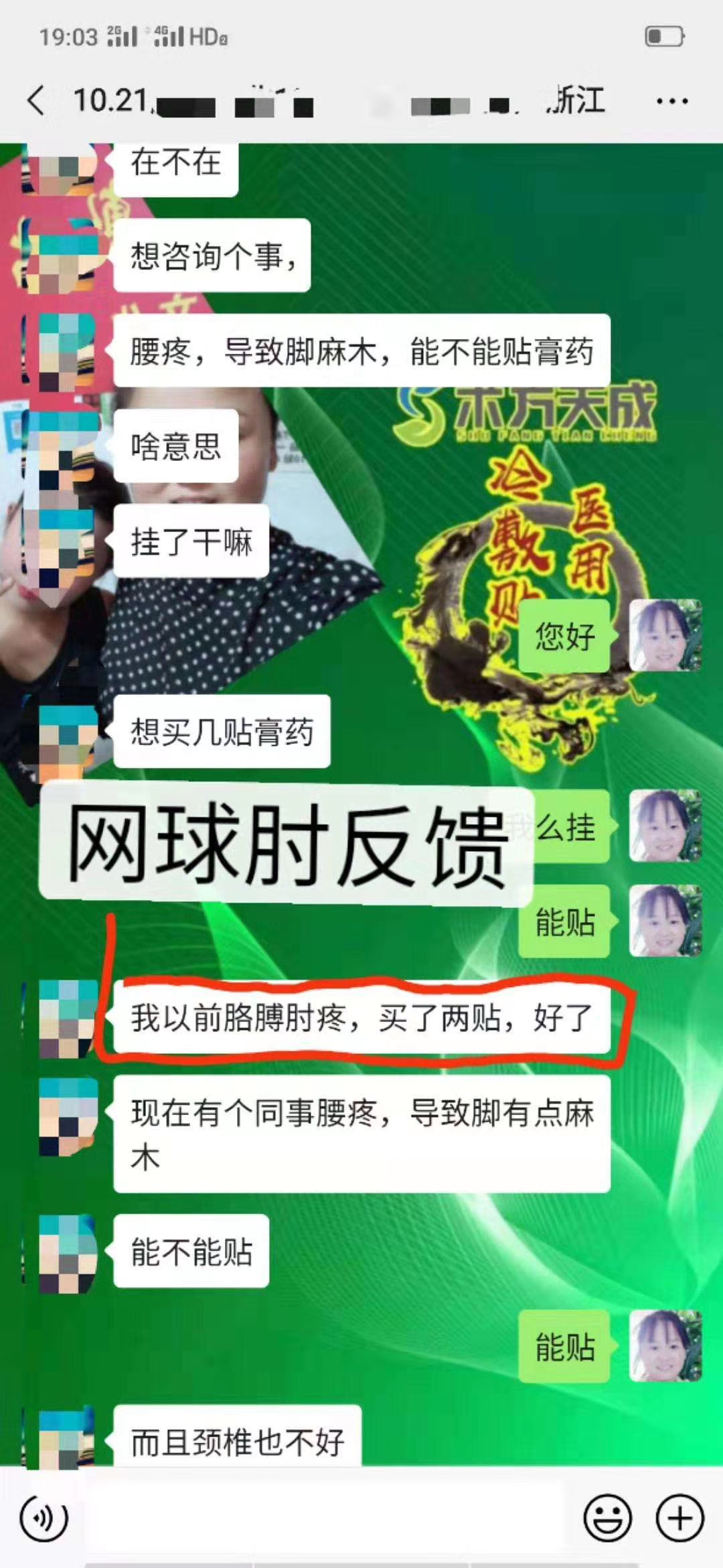 腱鞘炎反馈 无自用,不分享! 两位代理一位是贴好了自己的腱鞘炎,一位贴好了家人的腱鞘炎,咱们术方天成的经销商都是这么来的:见证效果,所以选择!
