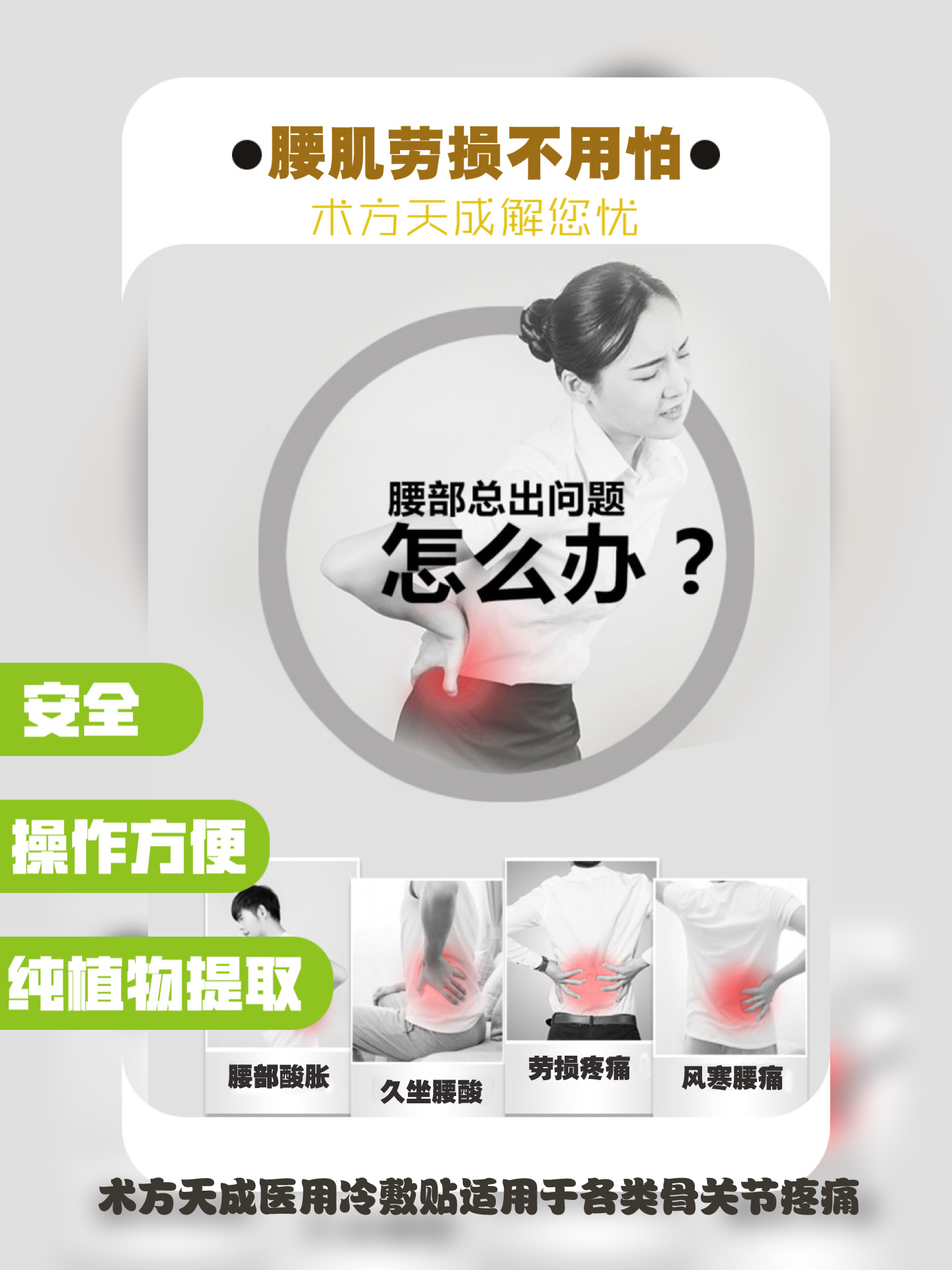 腰肌劳损不用怕 术方天成解您忧 腰肌劳损以腰部隐痛、反复发作、劳累后加重为主要表现。因腰部肌肉、韧带等软组织损伤导致疼痛,好发于30~50岁的中青年人,可表现出腰部疼痛及活动受限。