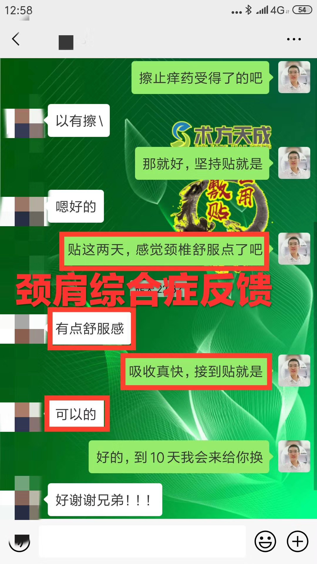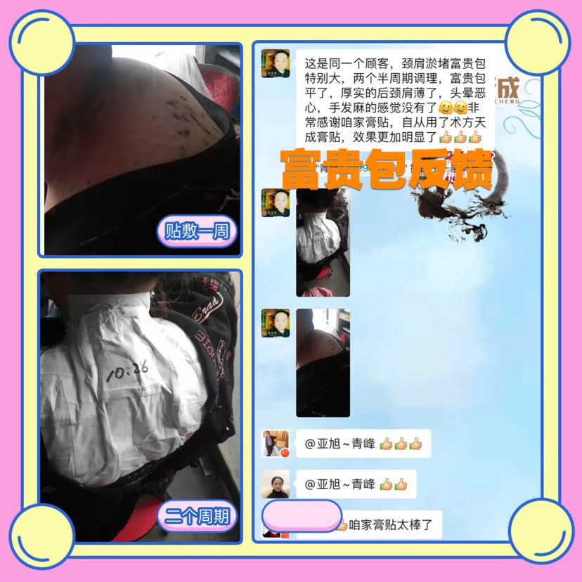 颈椎富贵包反馈 顾客颈椎富贵包引起头晕头痛,贴术方天成医用冷敷贴天后,头不痛了,富贵包还消了好多