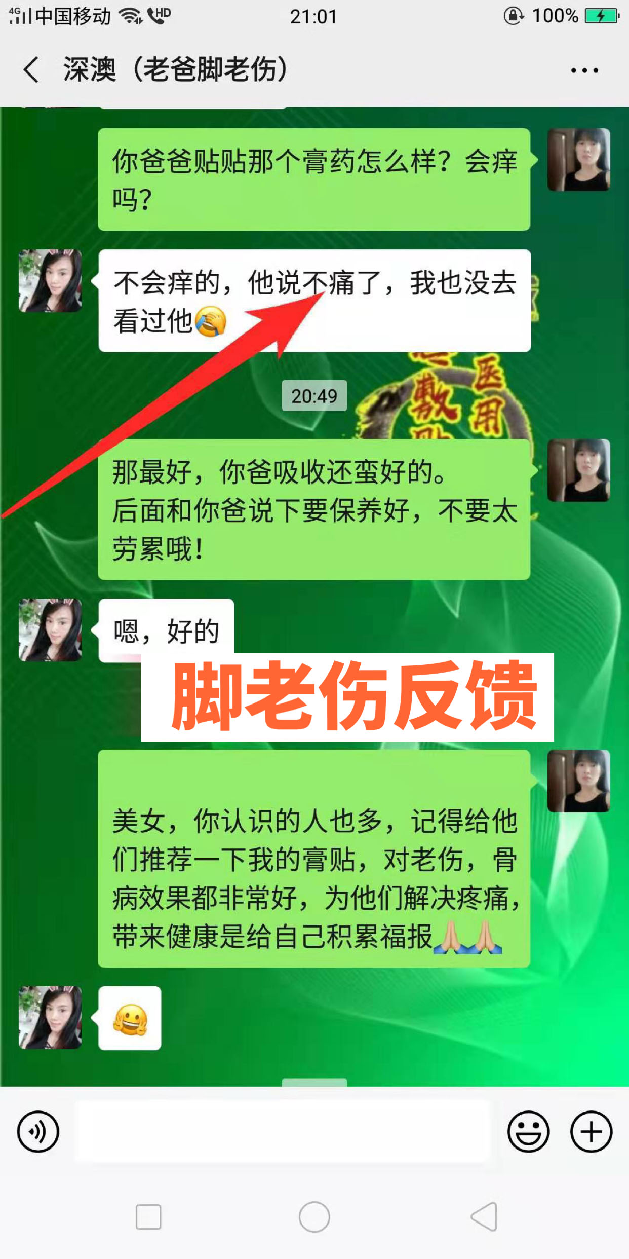 脚老伤反馈 又是一位孝顺的美女,买给父亲用,老人家反馈特别好,说不疼了