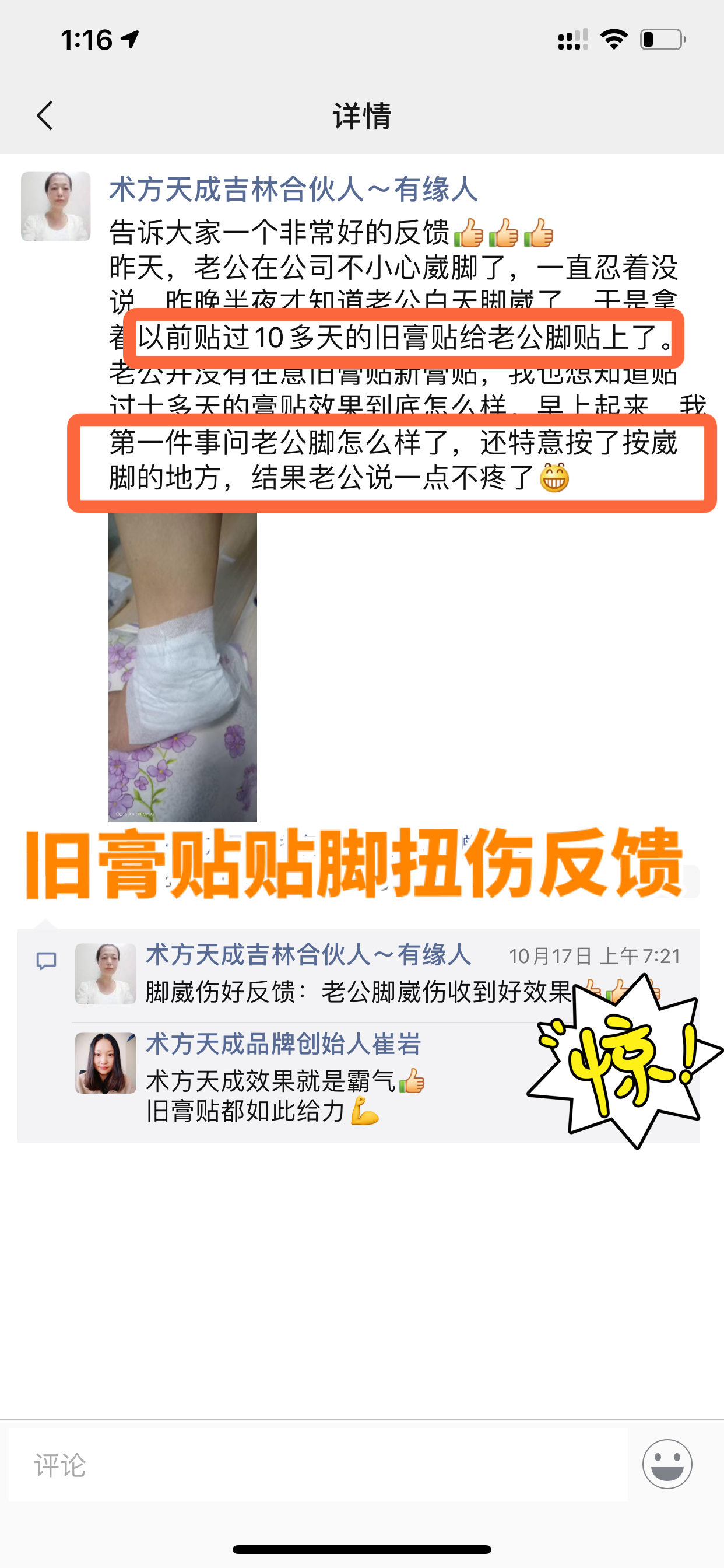 旧膏贴脚扭伤反馈 用了十多天的术方天成旧膏贴,给自家人贴脚扭伤,一晚上就一点都不疼了