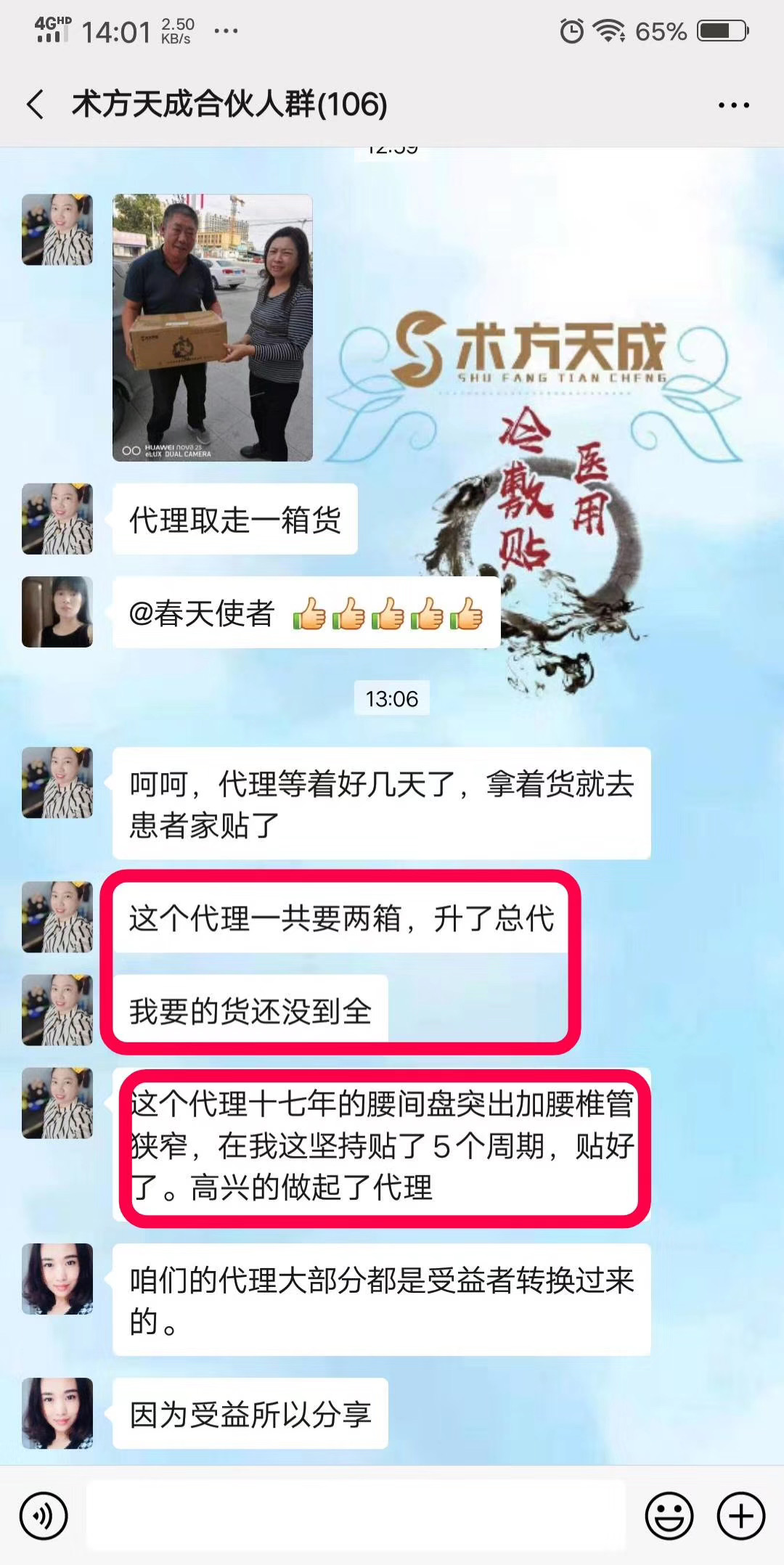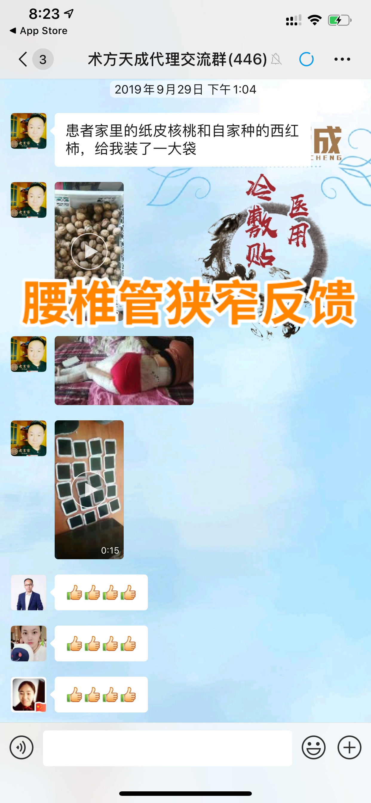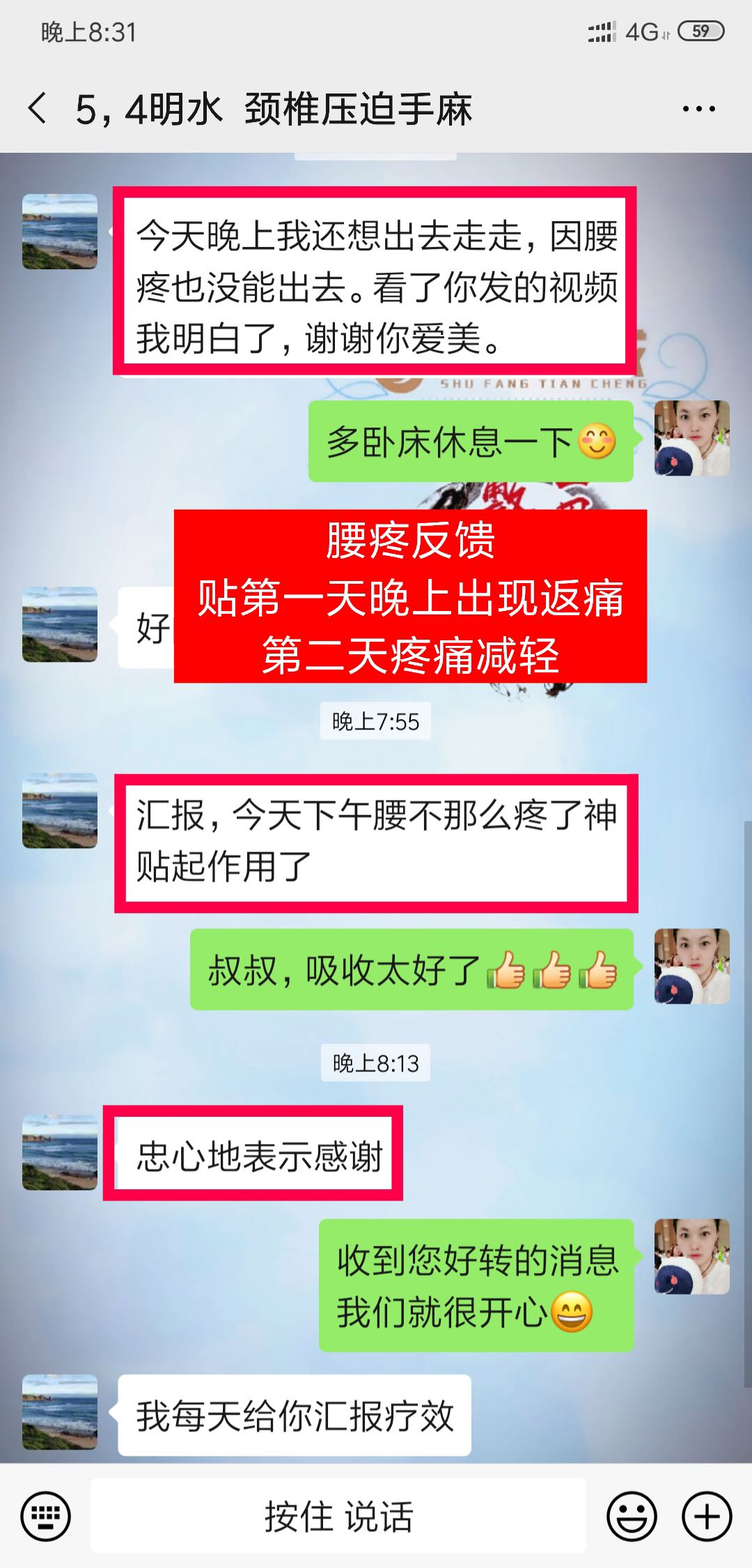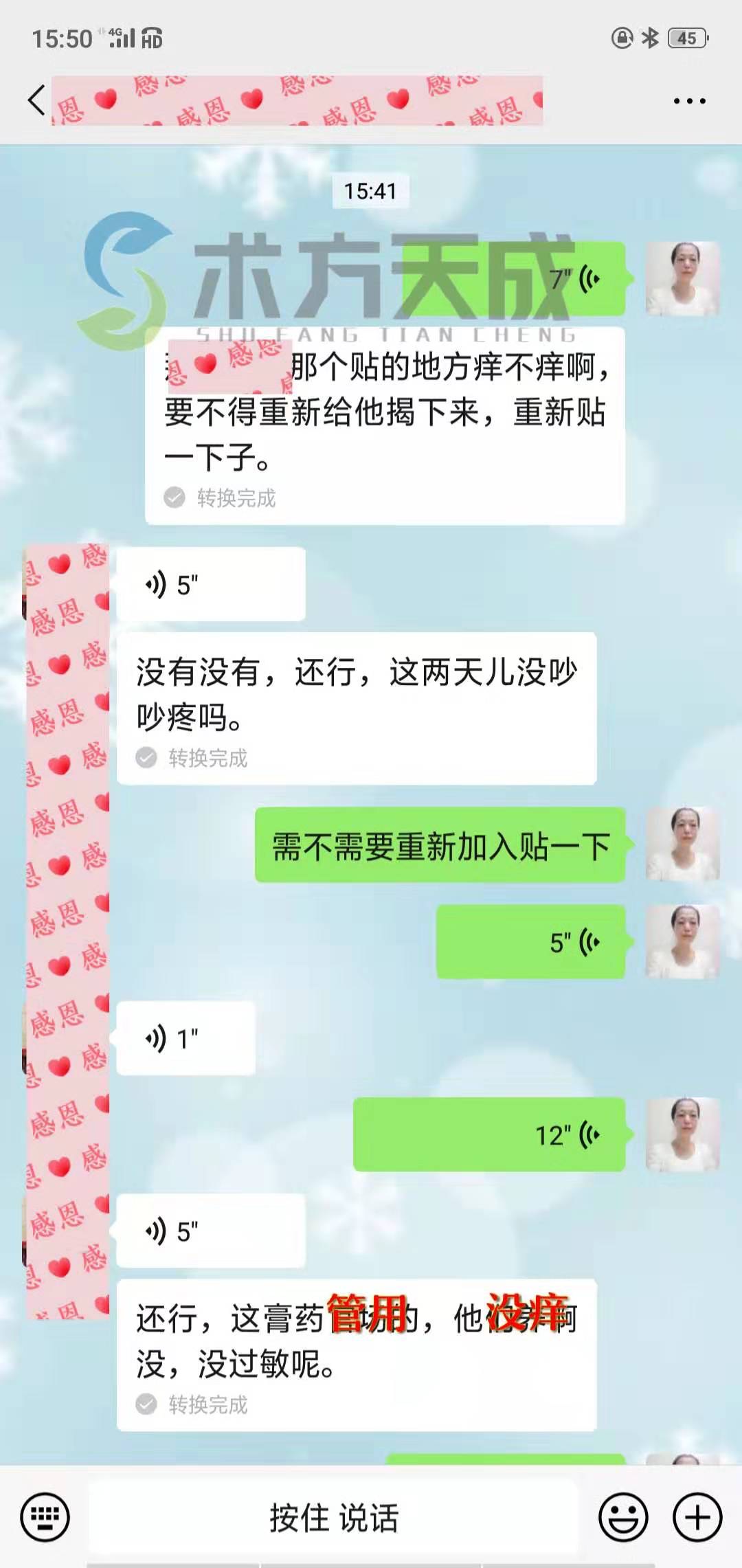 严重腰椎压迫神经反馈 贴之前身体没有知觉,源于对术方天成的信任一次27贴,贴到第四十天,顾客反馈说腿部已经开始有知觉了,感觉到疼了!